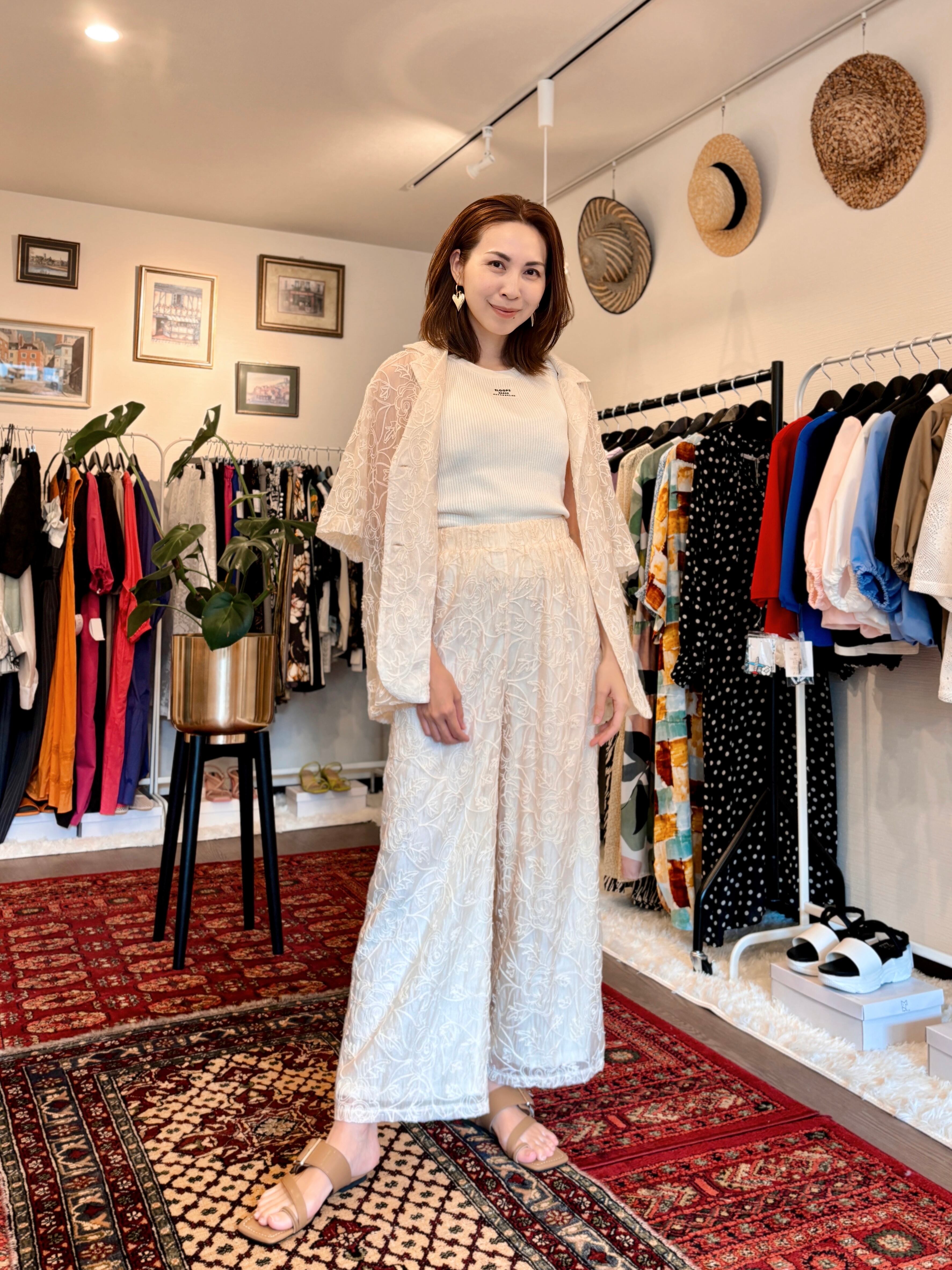 透け感のあるオーガンジー素材と刺繍の立体感が、カジュアルながらも女性らしさを引き立てます。