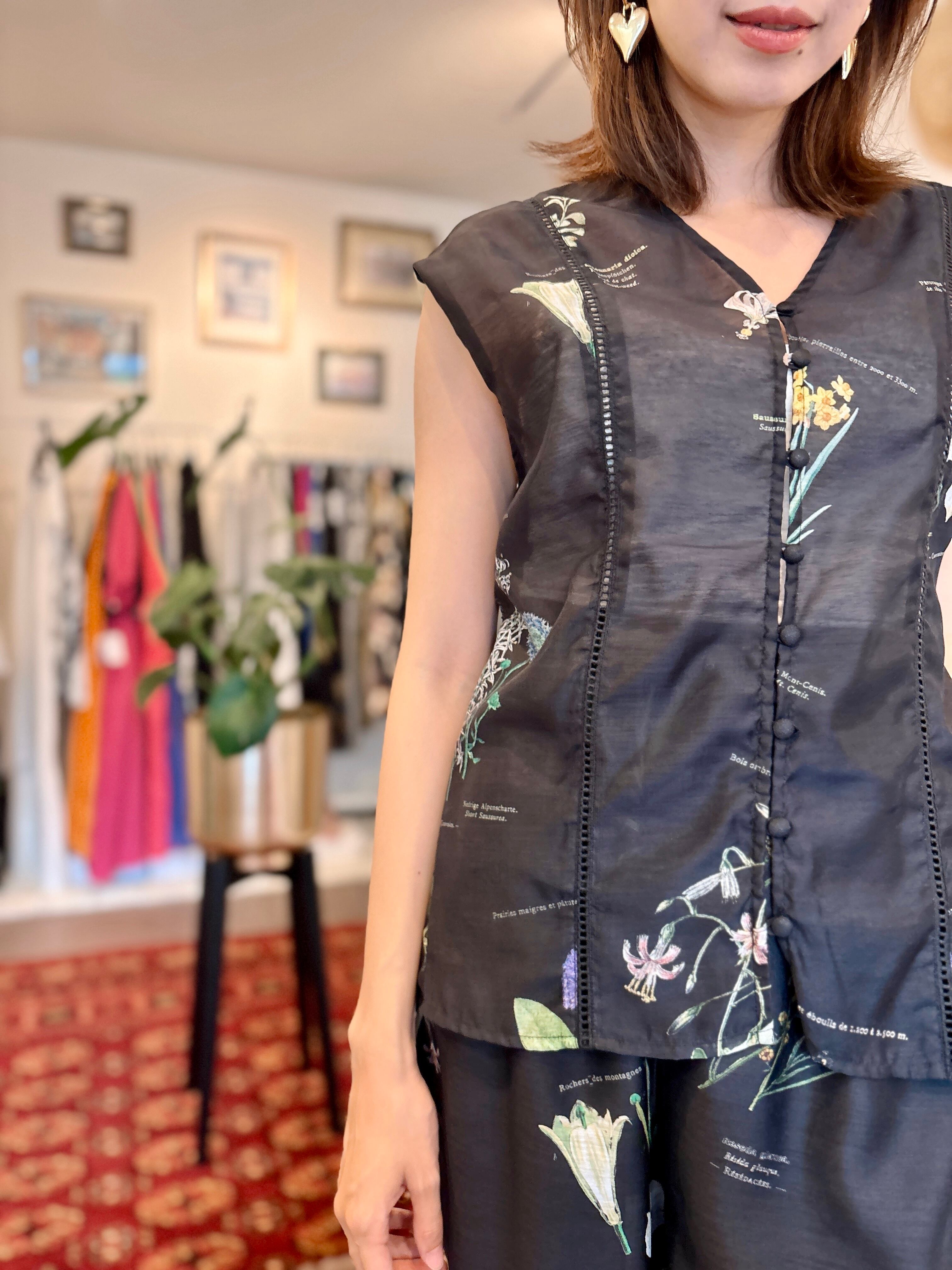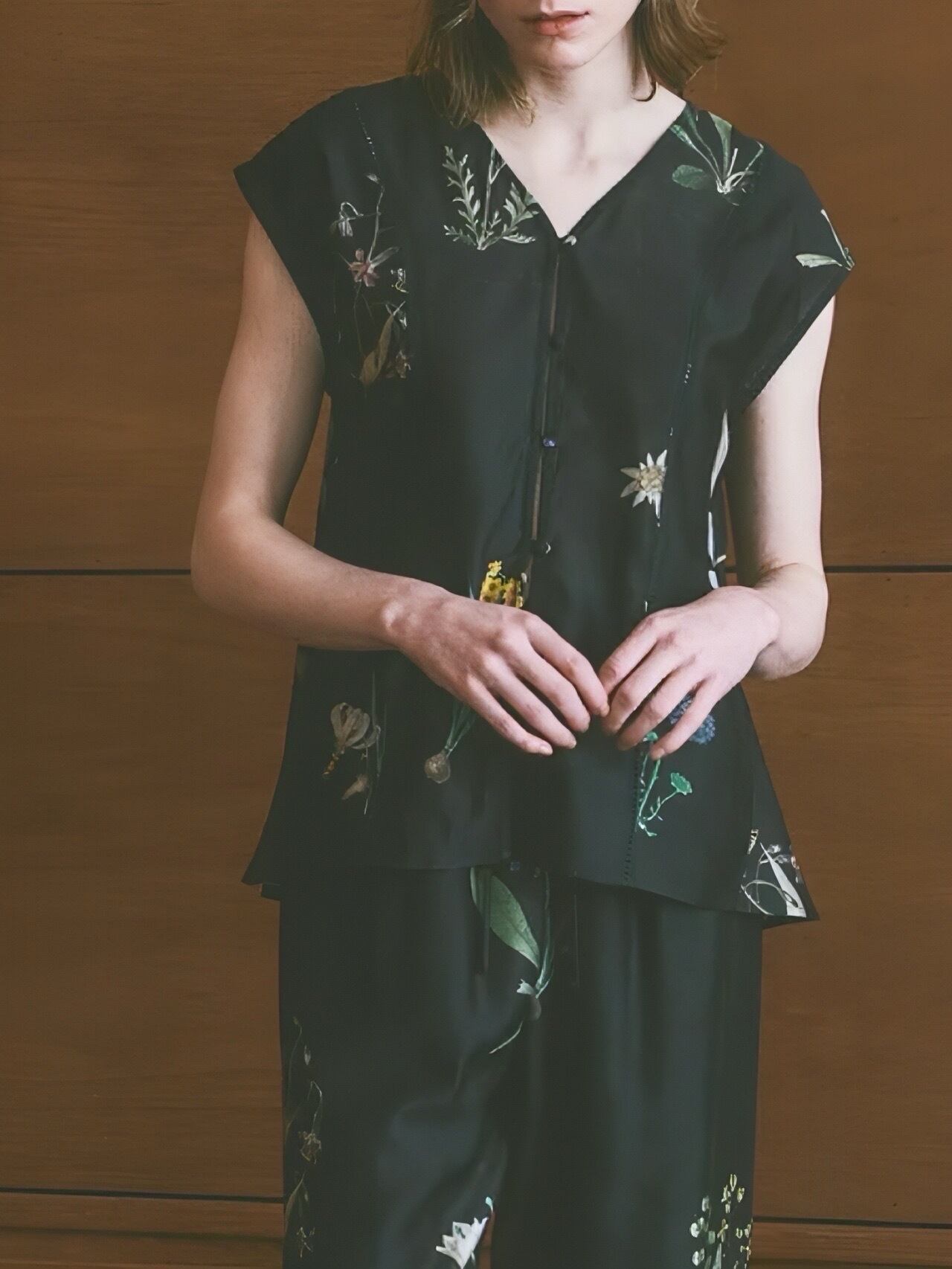 上品に仕上げたオリジナルのフラワープリントが女性らしさを引き立て、コーディネートにアクセントを加える魅力的な1枚です。