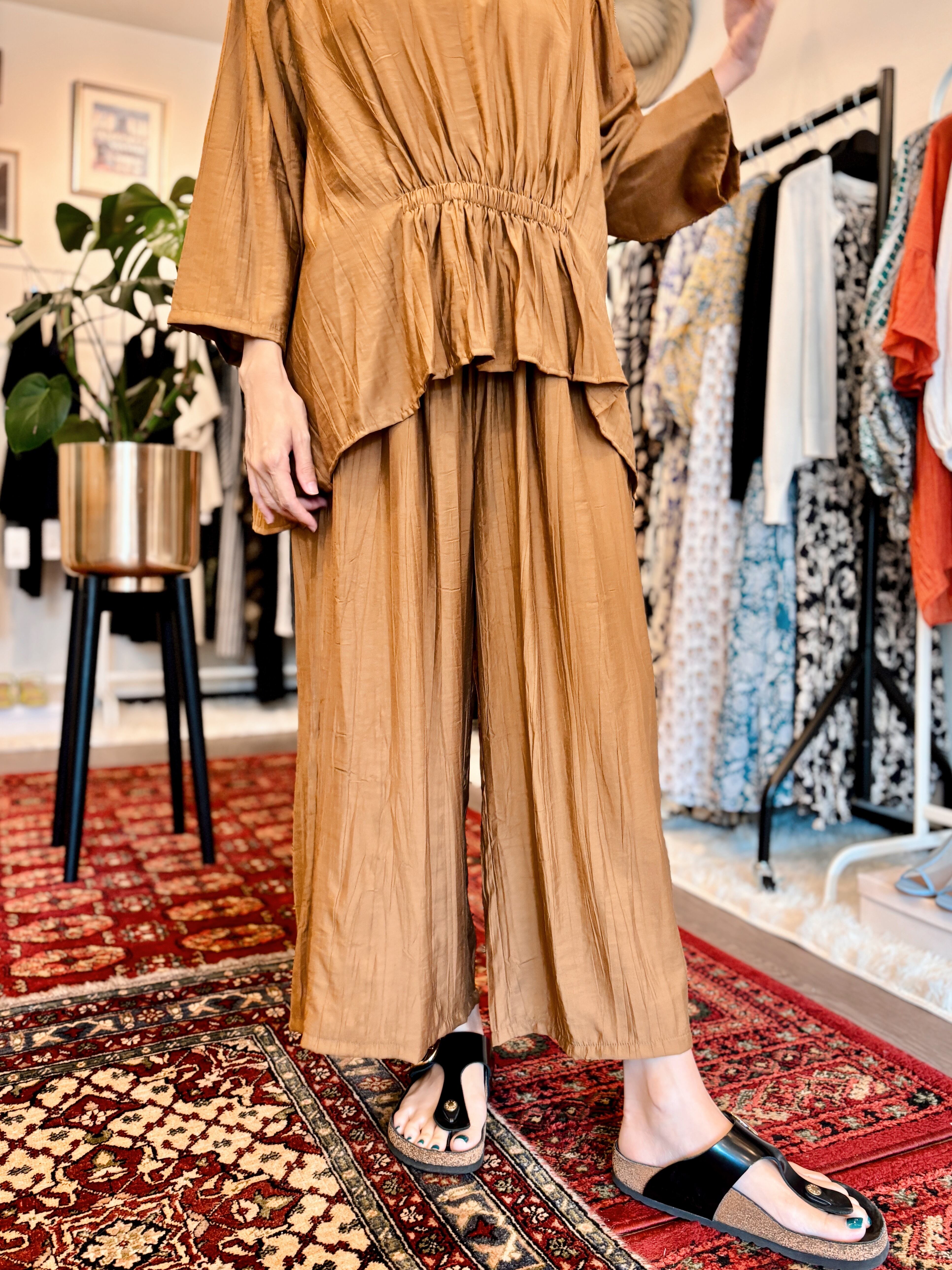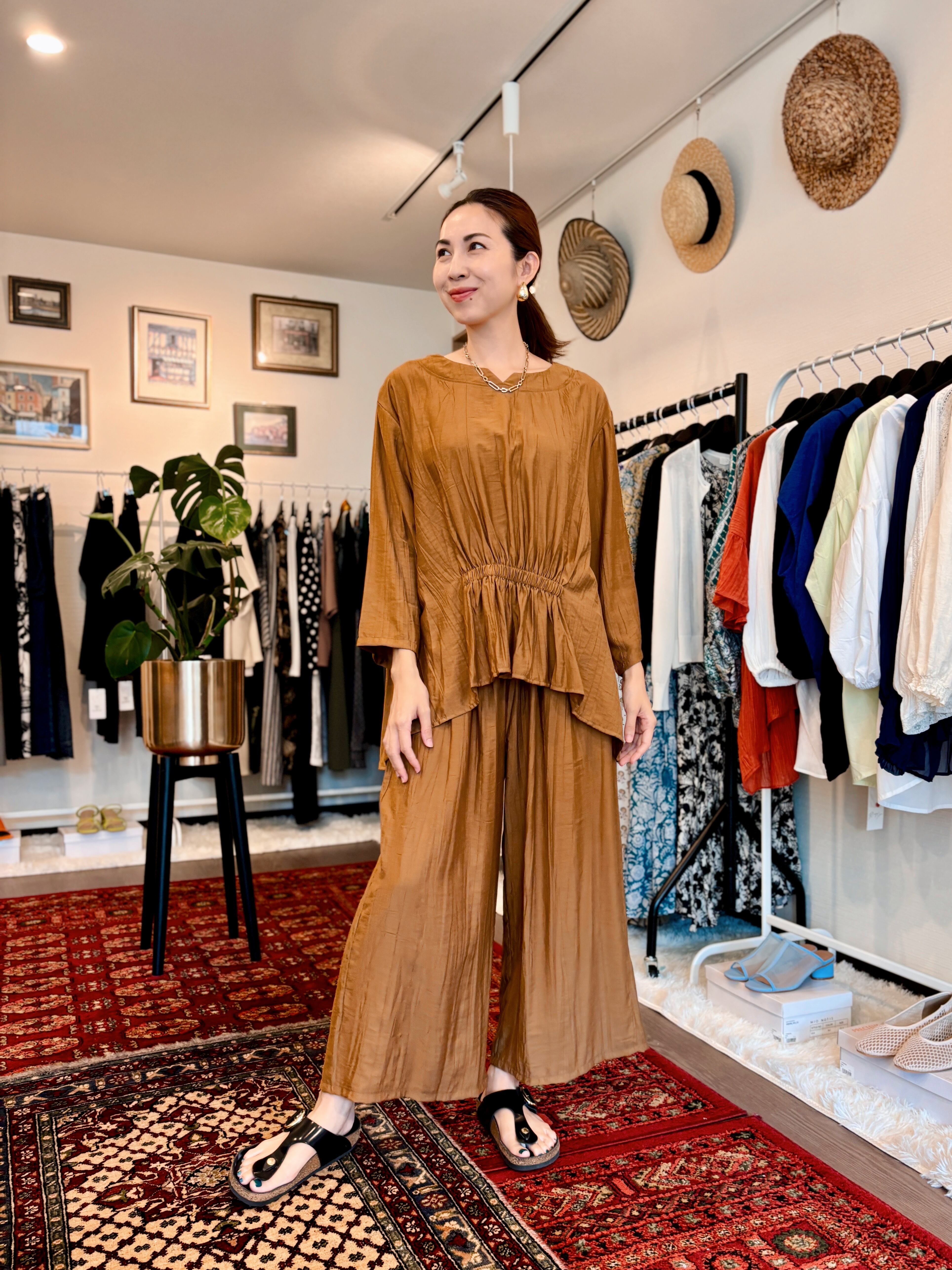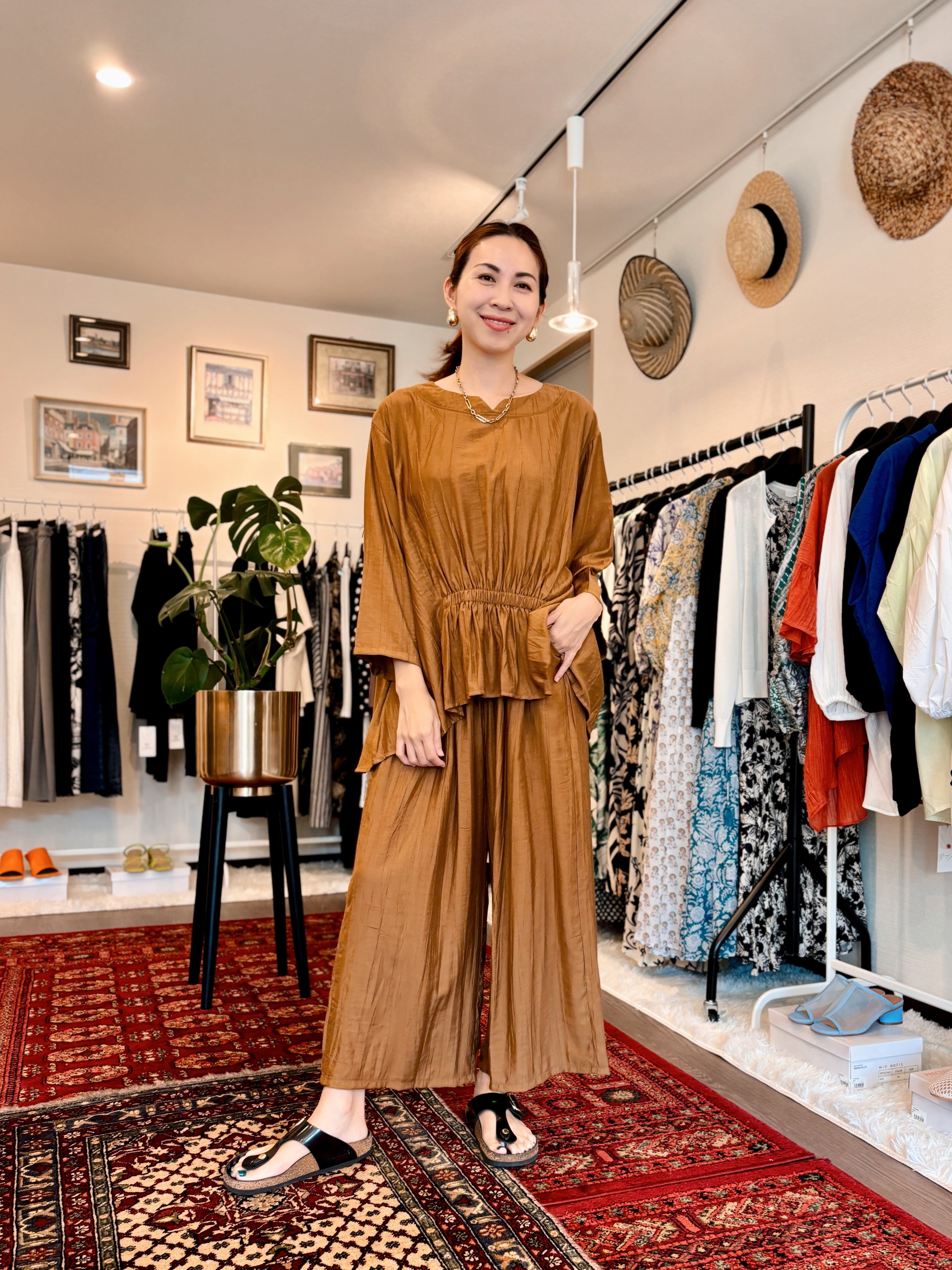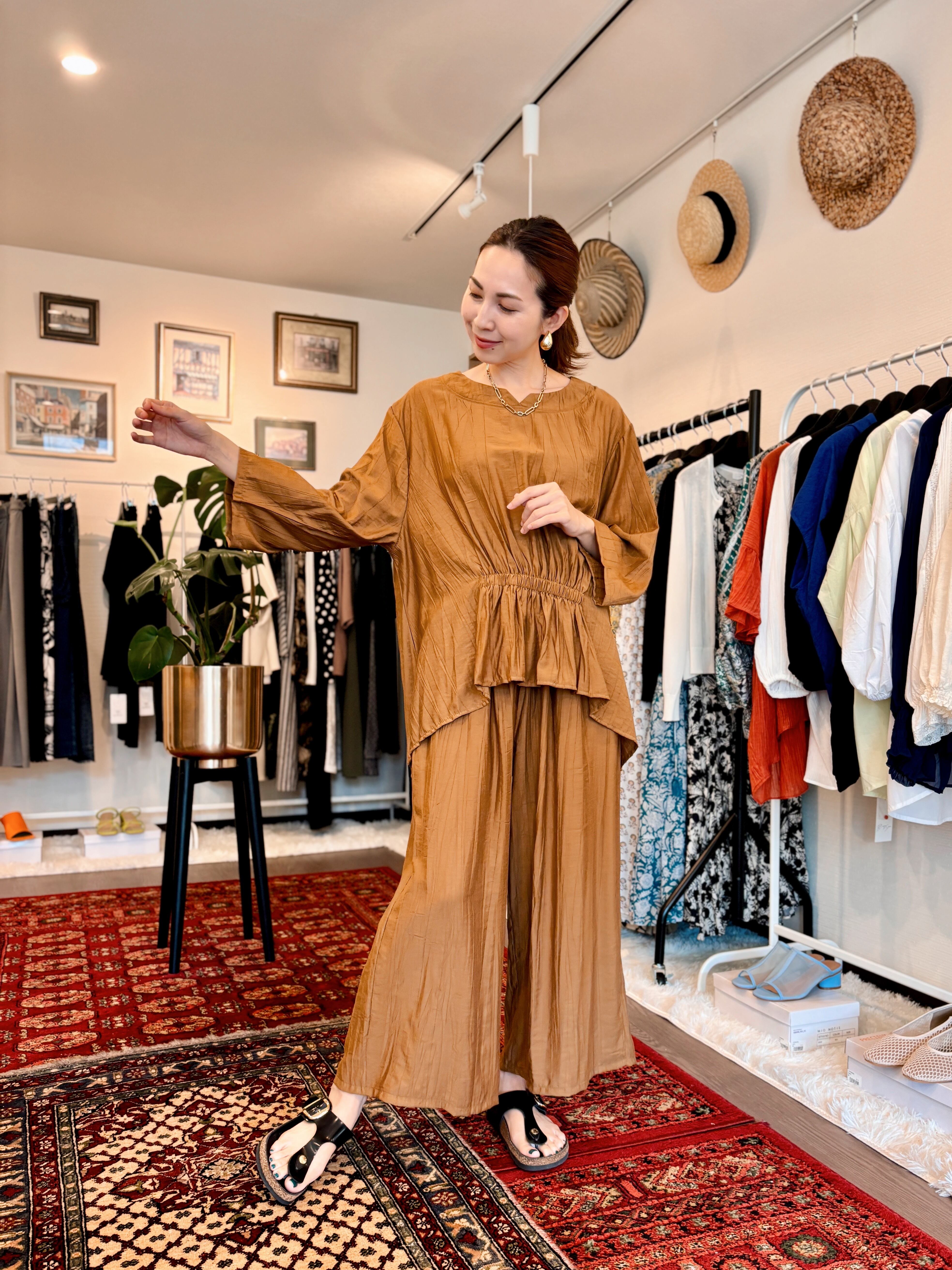 マットな光沢のある生地でリラックス感と高級感を両立させた大人のセットアップ。