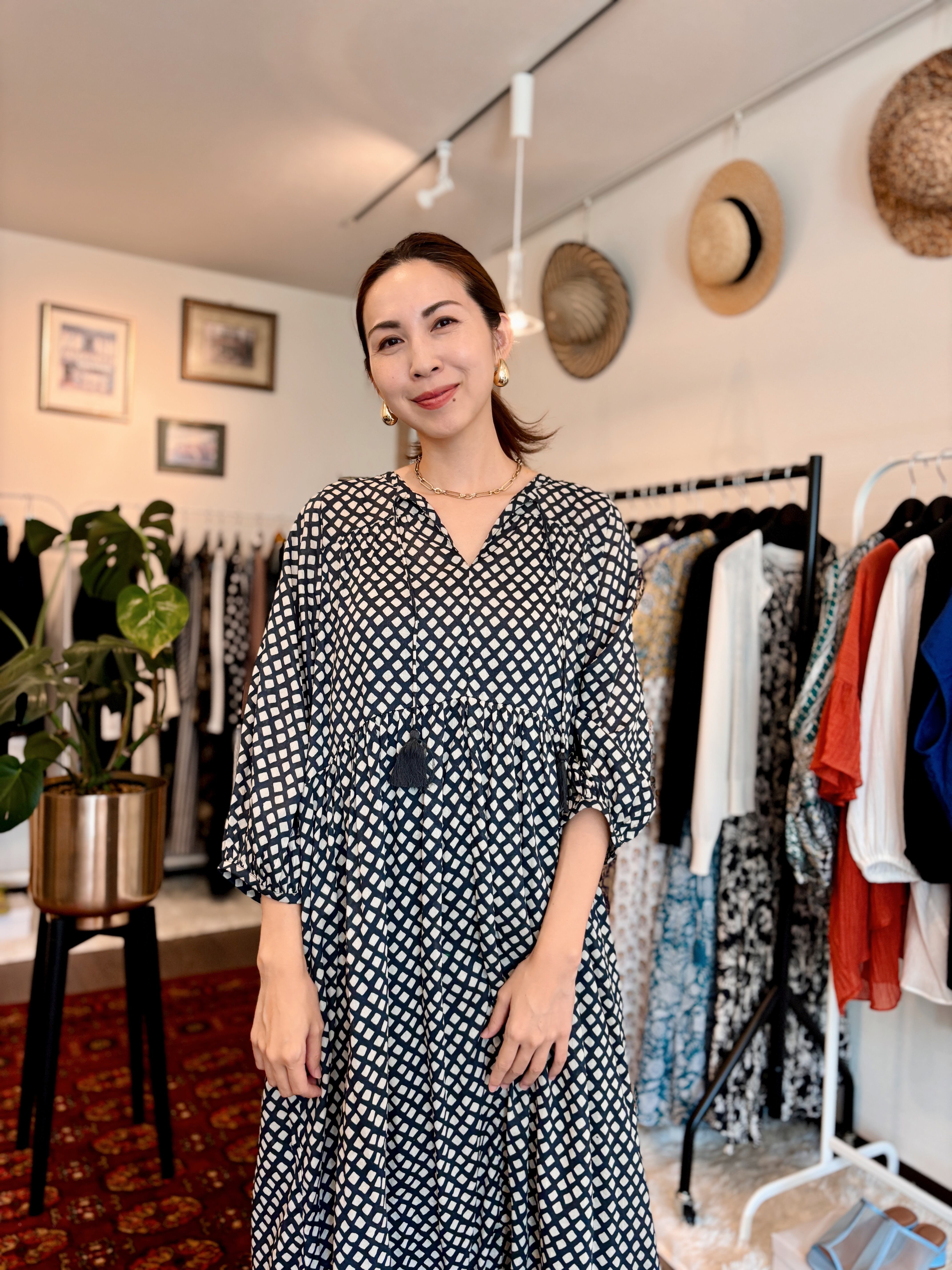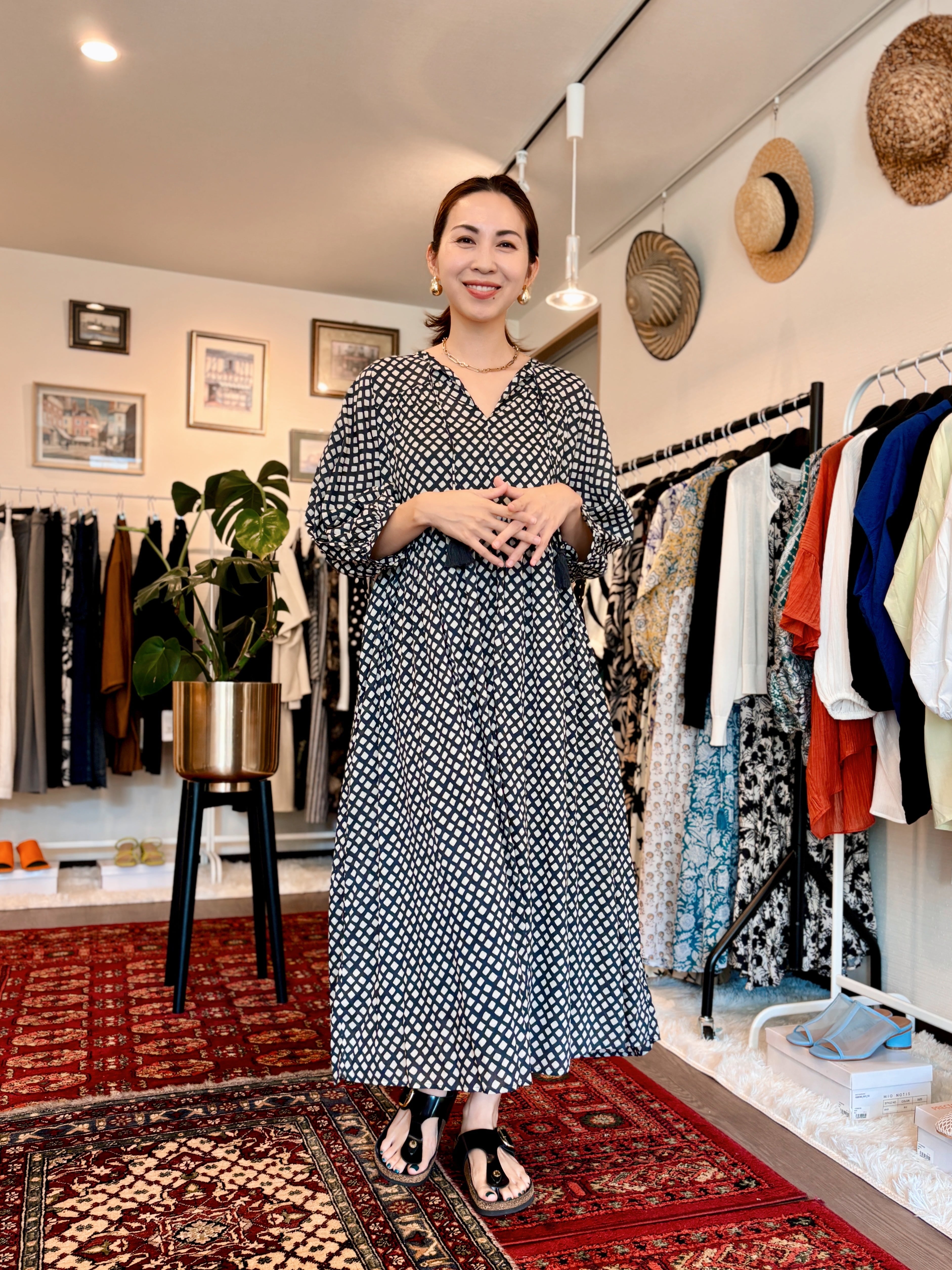 ダイヤ柄プリントを用いた、ふんわりエアリーなボリュームワンピース。