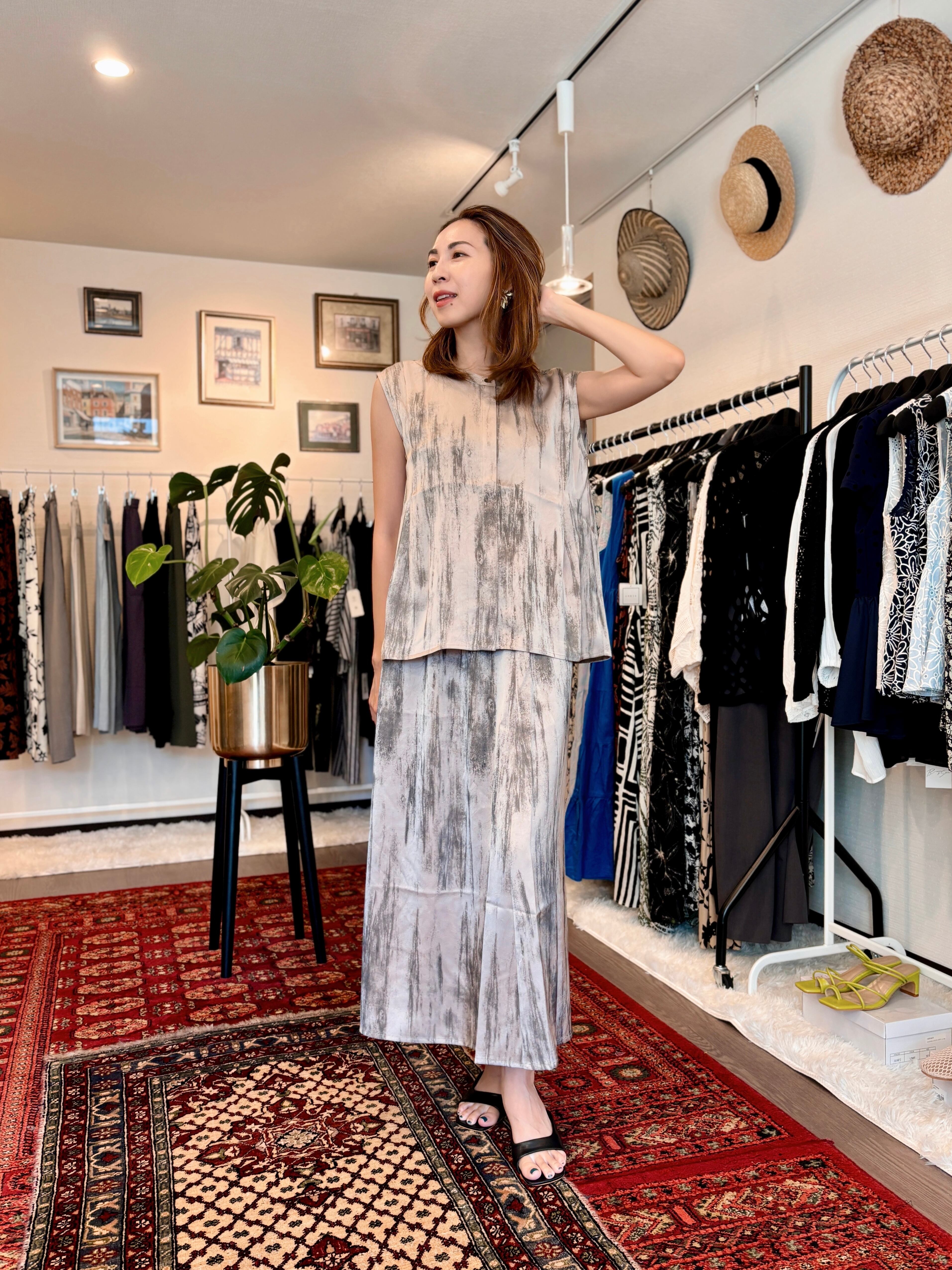こんな大人のセットアップを待っていた!オープンカラーのノースリブラウスとマキシスカートがセットアップになったシンプルな大人カジュアルのアイテム。トップスもボトムもストンと着やすいデザイン。リラックスシルエットで幅広い体型の方にご着用頂けます。カジュアルとエレガントがミックスされたようなオトナカジュアル派におすすめアイテム。ブラウスはボタンが隠れる比翼仕立てのノーカラーデザインに二の腕がキレイに見えるちょこっとフレンチ袖。