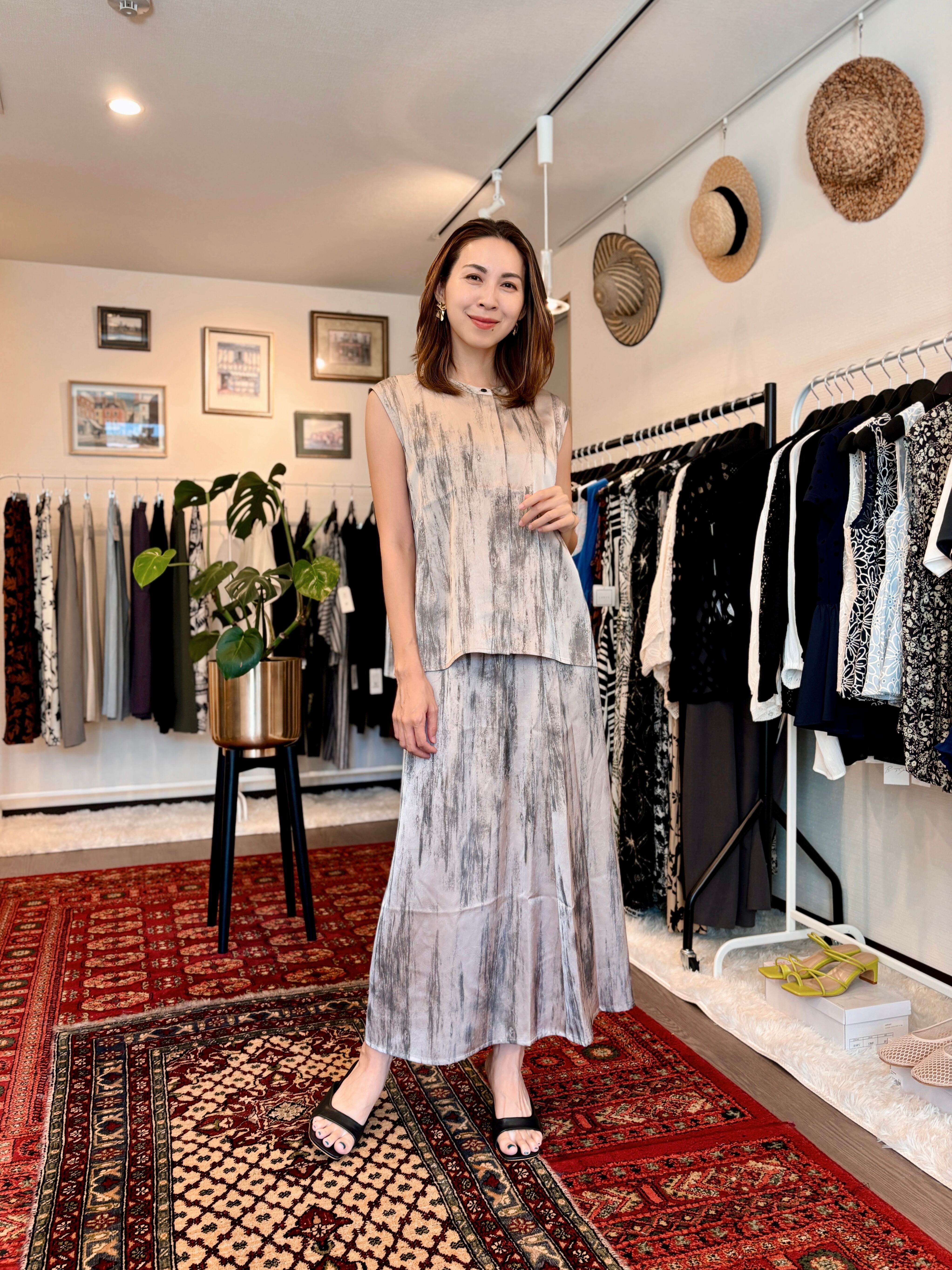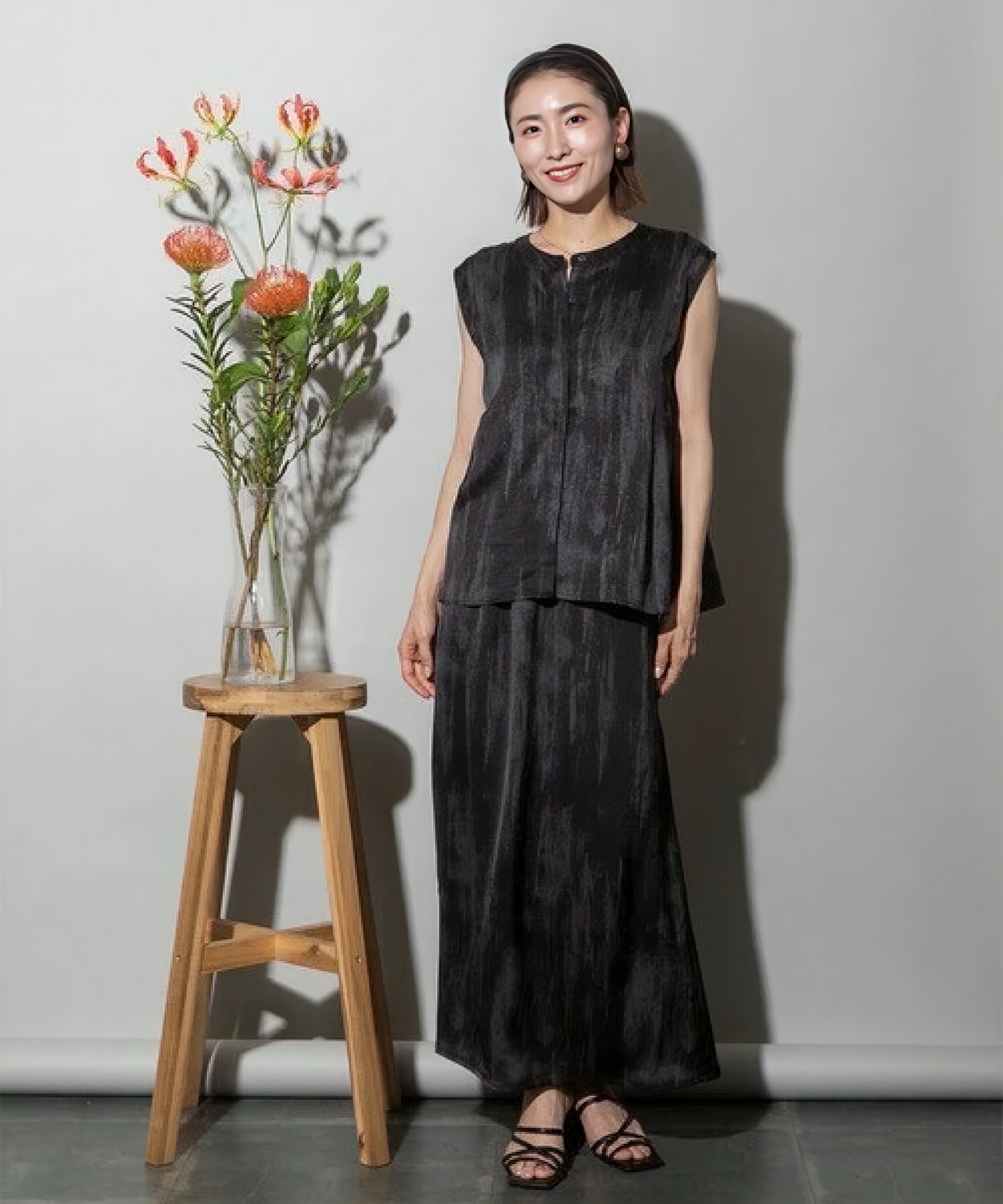 こんな大人のセットアップを待っていた!オープンカラーのノースリブラウスとマキシスカートがセットアップになったシンプルな大人カジュアルのアイテム。トップスもボトムもストンと着やすいデザイン。リラックスシルエットで幅広い体型の方にご着用頂けます。カジュアルとエレガントがミックスされたようなオトナカジュアル派におすすめアイテム。スカートは脚長効果のIラインシルエット。ウエストは安心のゴム仕様。