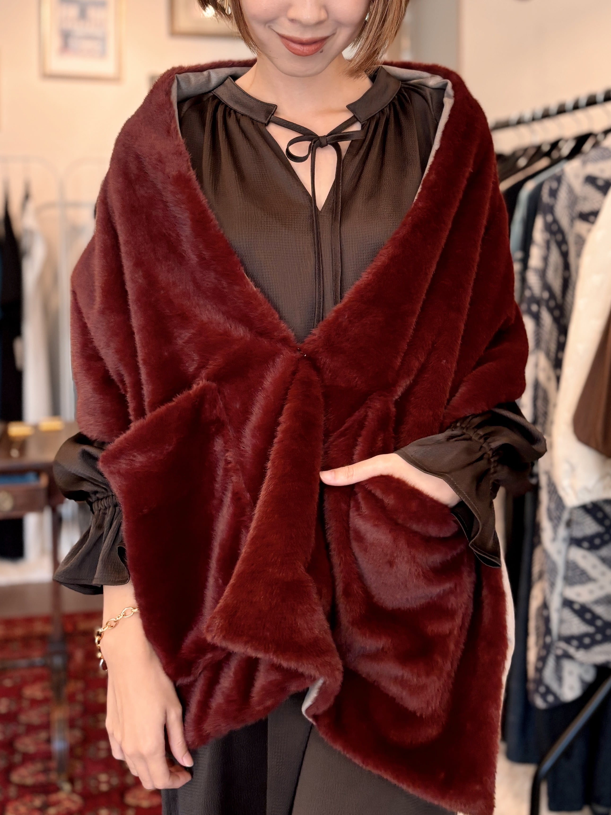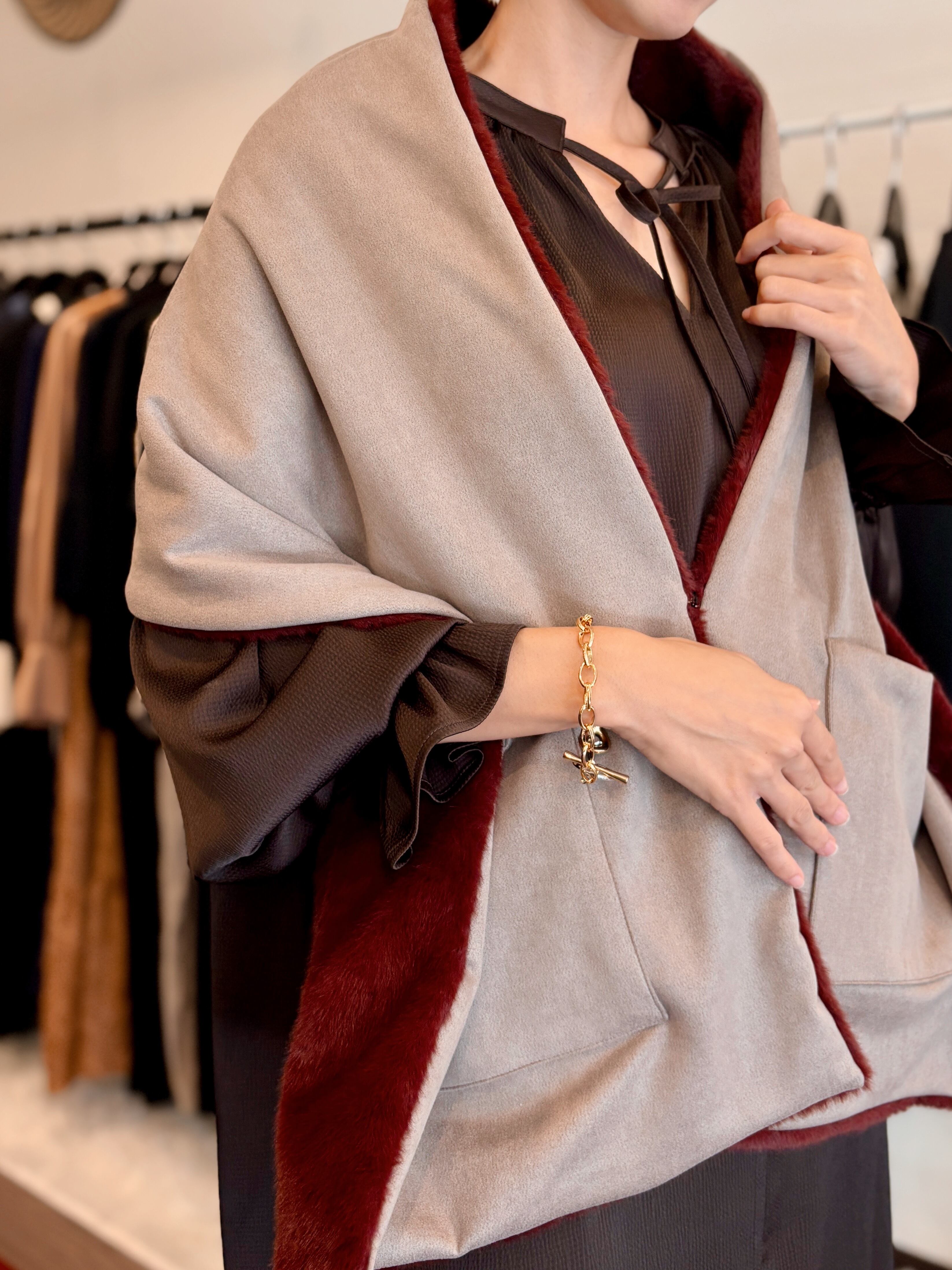 柔らかいイミテーションのファーとスウェードの配色両面使いのアイテムです。