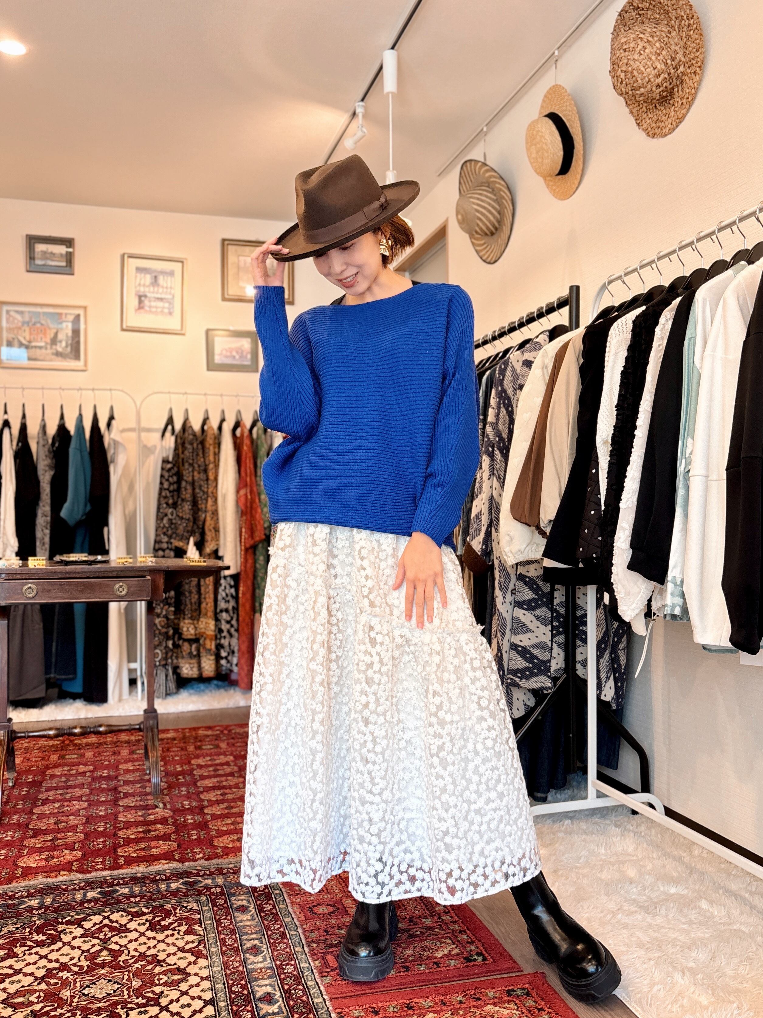 しっとりなめらかなボートネックドルマンニット。横リブの立体的な表明感に、肌触りの良い生地です。