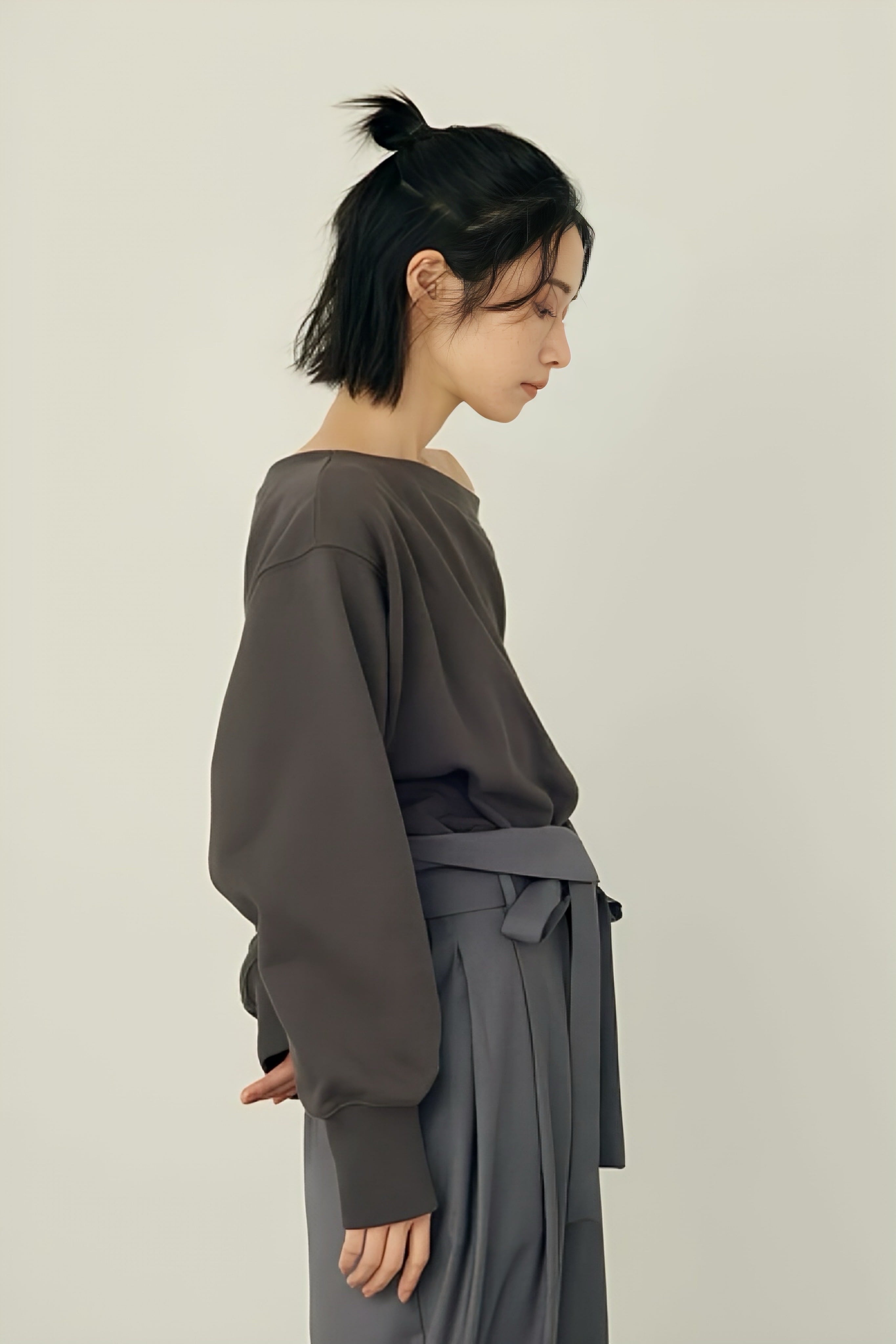 幅広ヘムとロングリブ袖口が生む、メリハリのあるシルエットのスウェット。