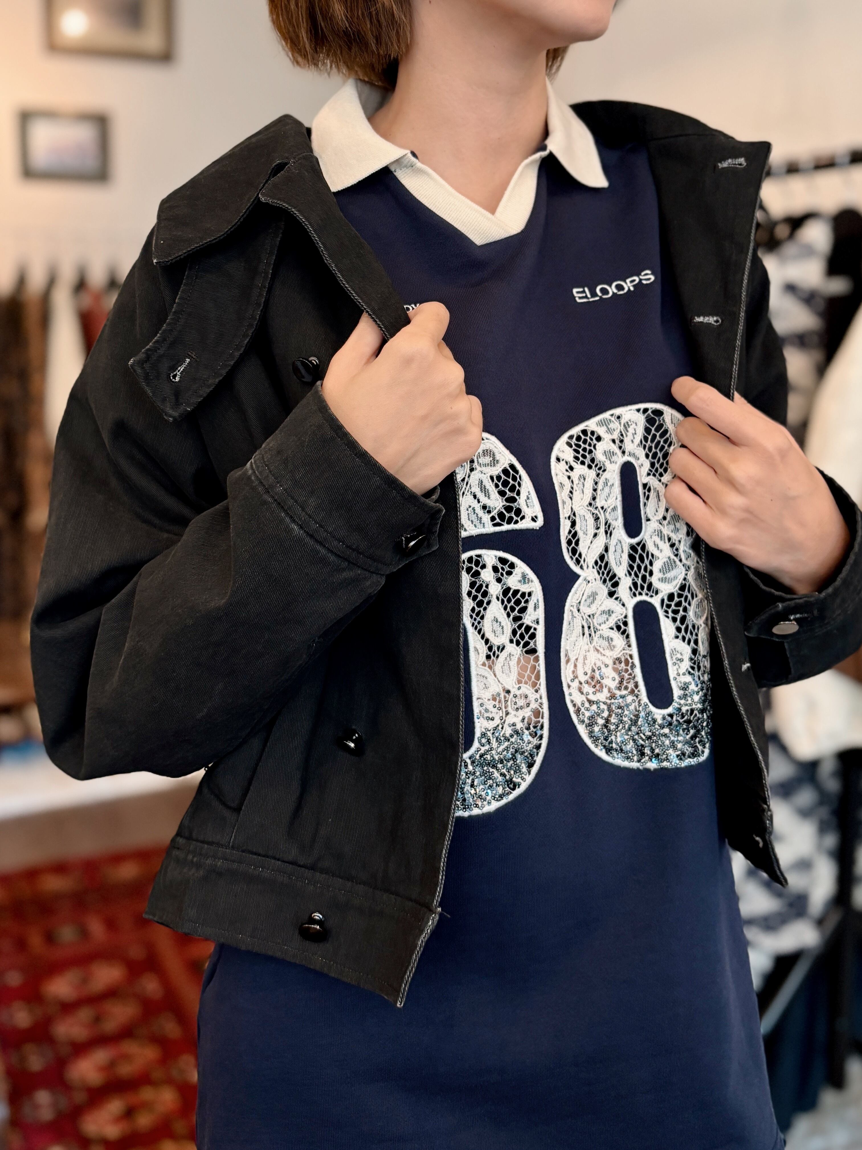 刺繍レースのナンバリングが目を惹くオーバーサイズのスウェット。
