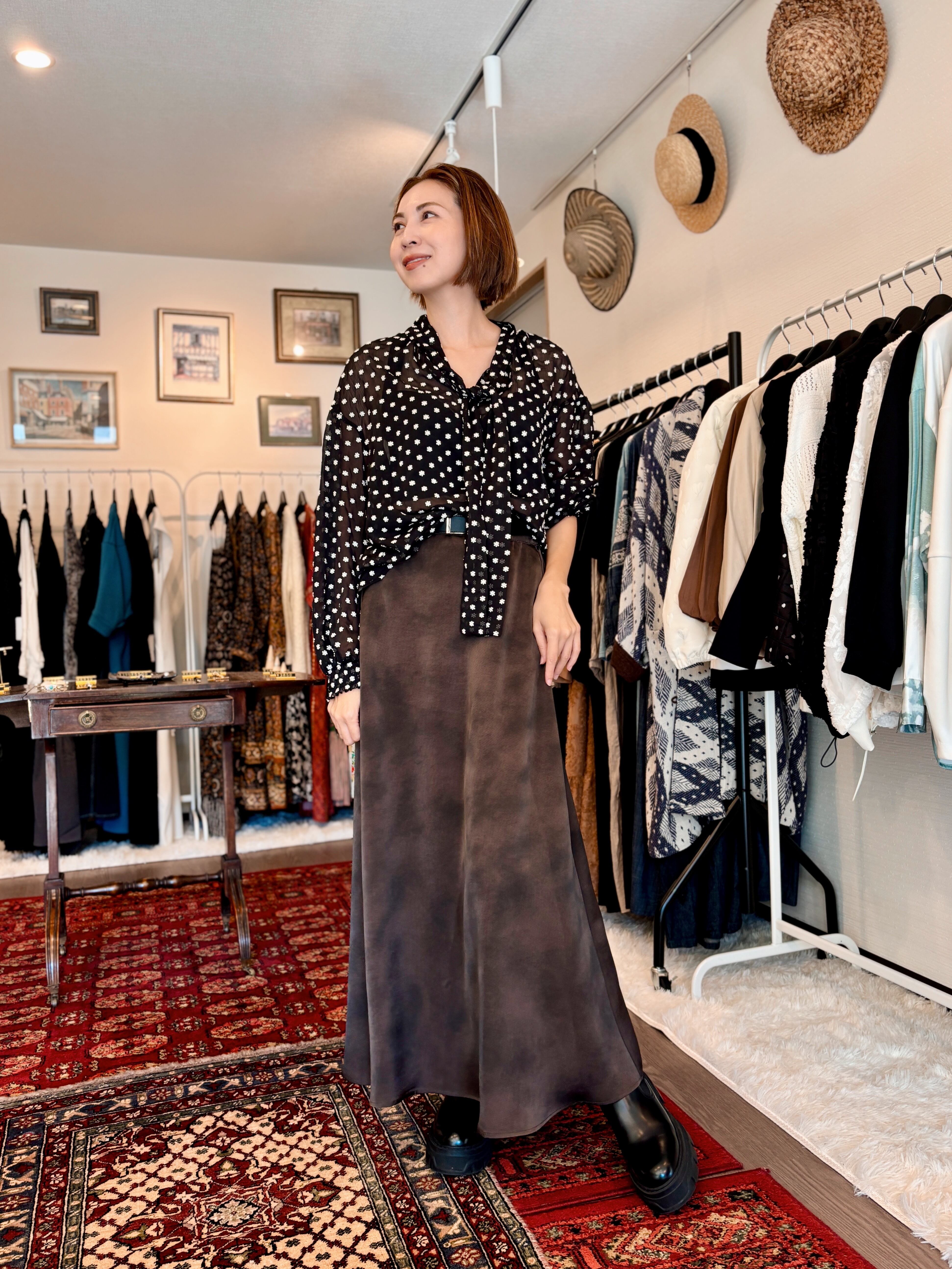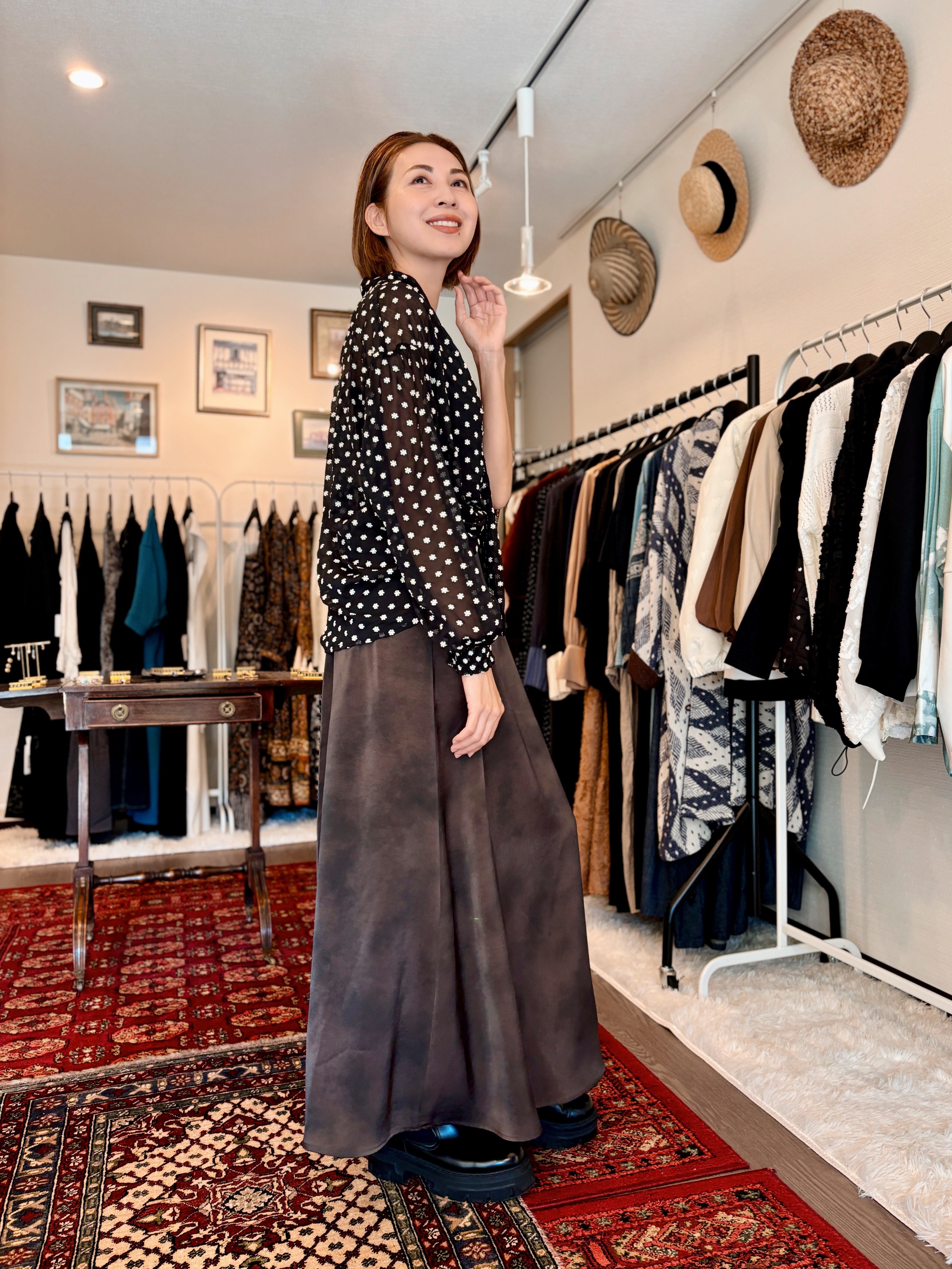 光沢感が出すぎないマットなサテン生地に、ニュアンス柄が洗練さをプラス。落ち感のあるしなやかな生地が、歩くたび揺れるモードな一枚です。