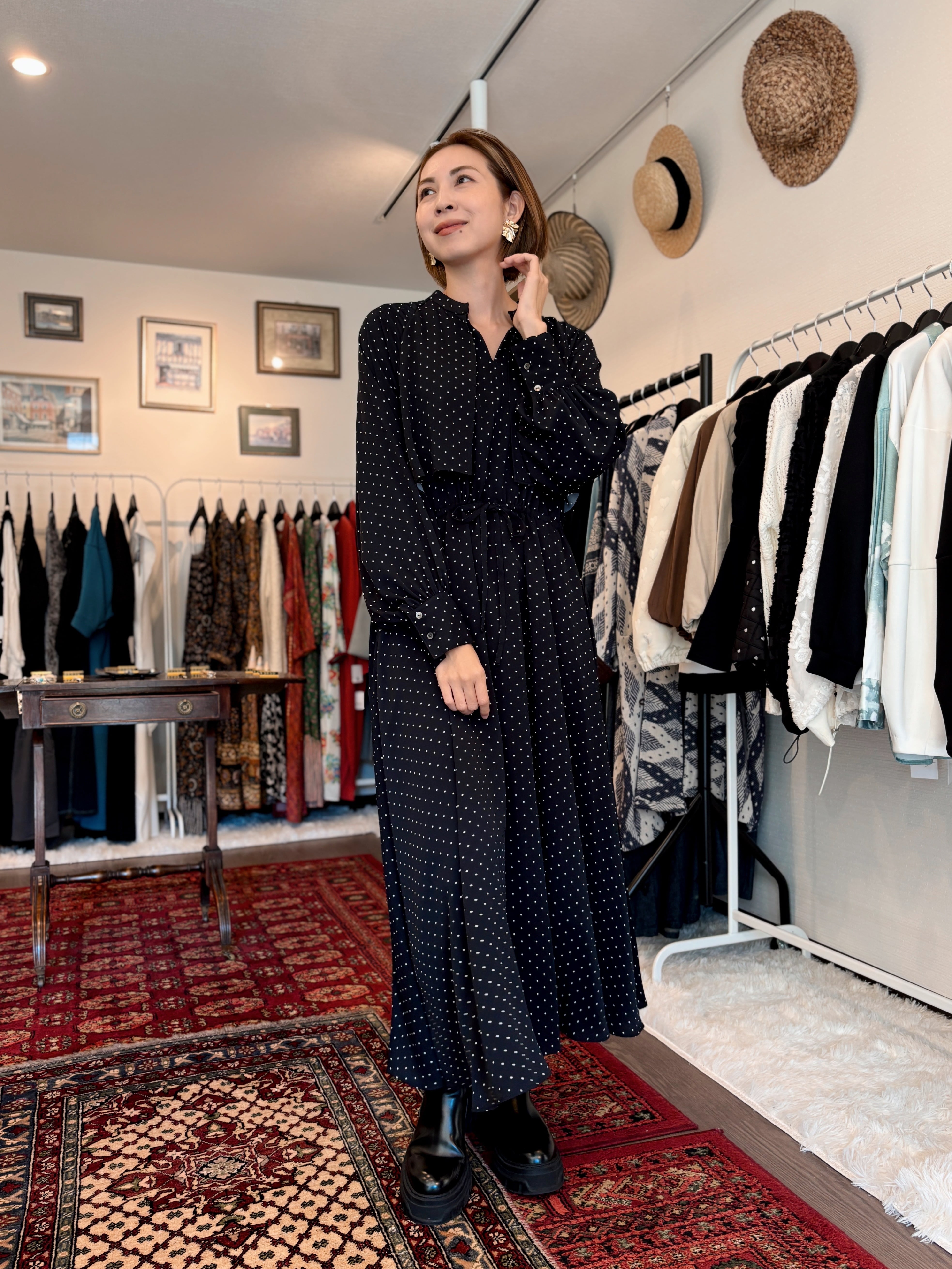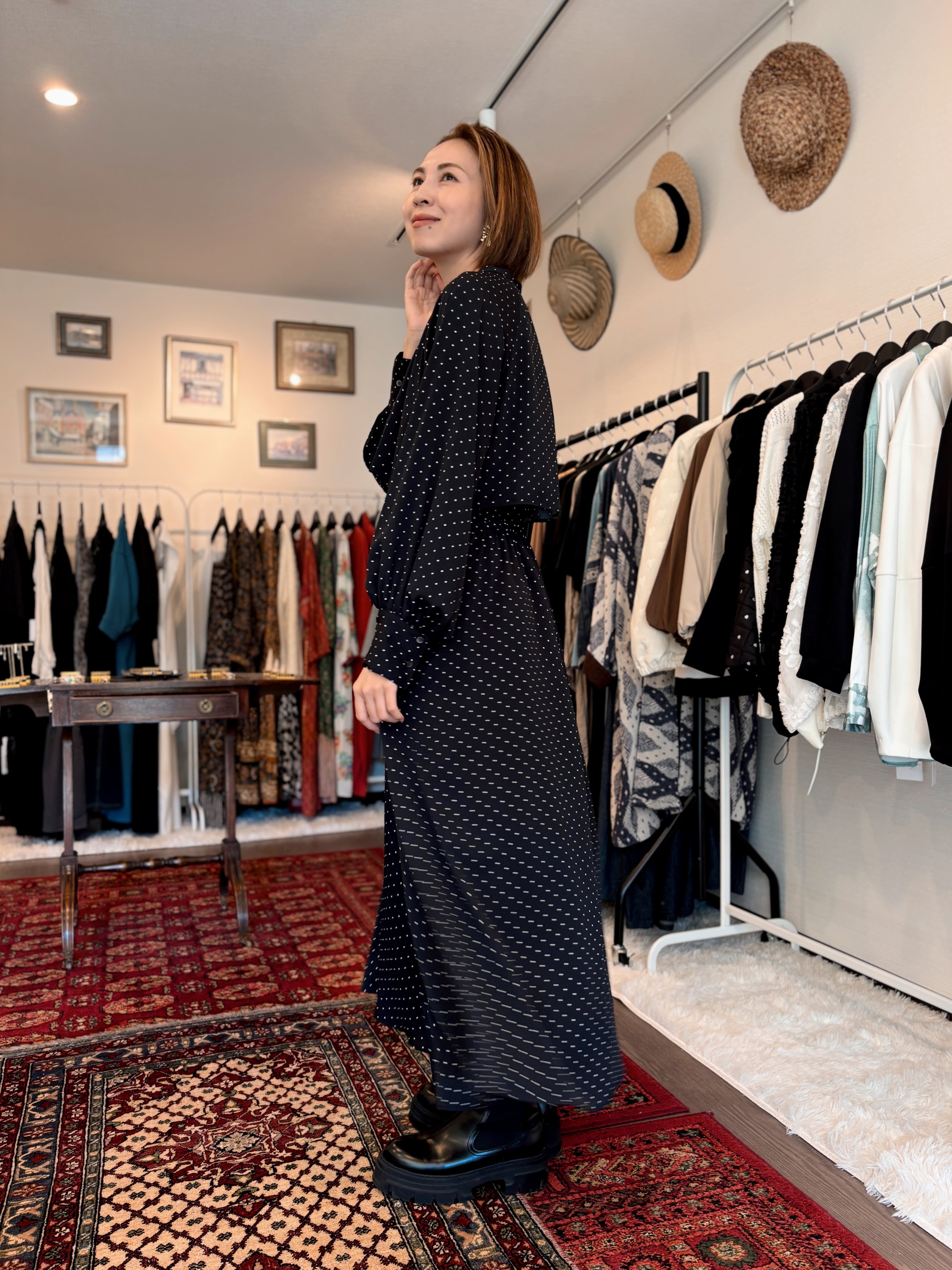 落ち感のあるサテン生地に、大人っぽい小さめのドットをプリントしたオリジナル素材。ケープデザインが華やかで一枚で着映えしてくれます。