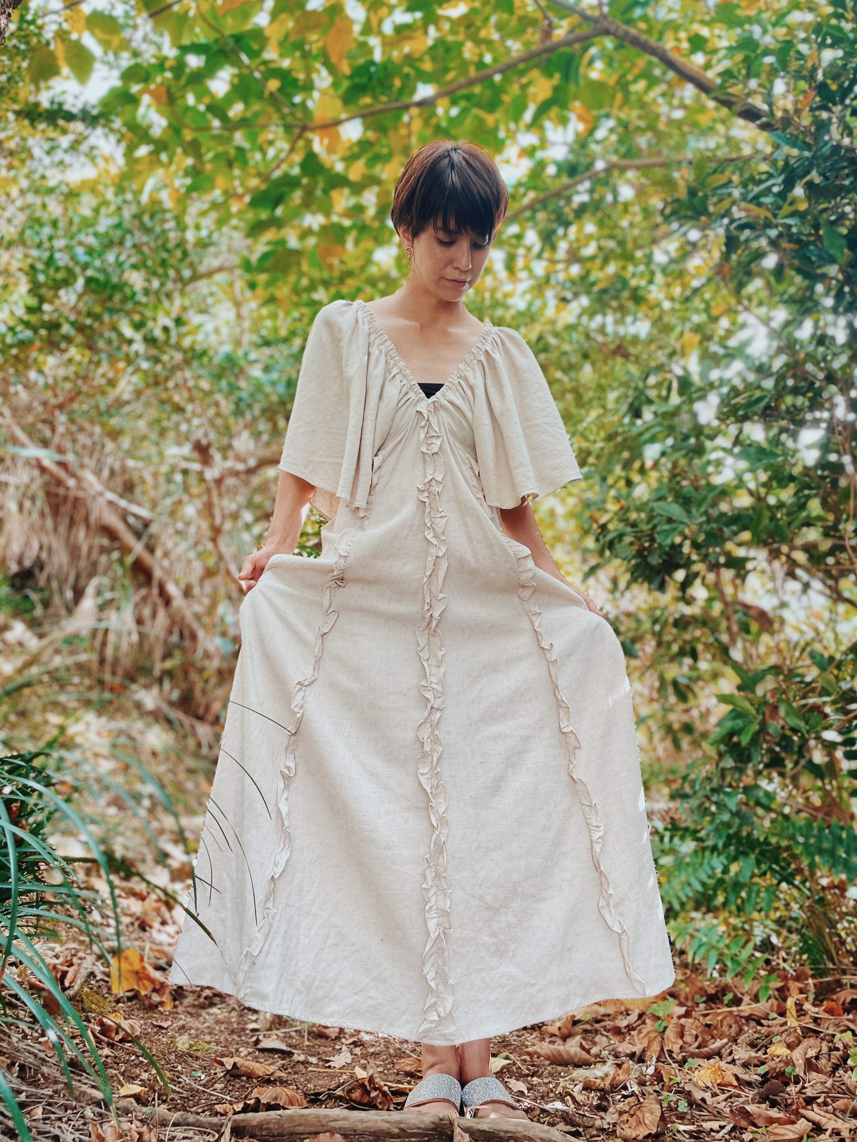 リネンのナチュラルな色味が味わい深く、フリルが付いているのになぜか甘過ぎないのはこのリネンの生地感に表情があるから子供っぽくなく、大人が着て相当しい雰囲気に完成しております。