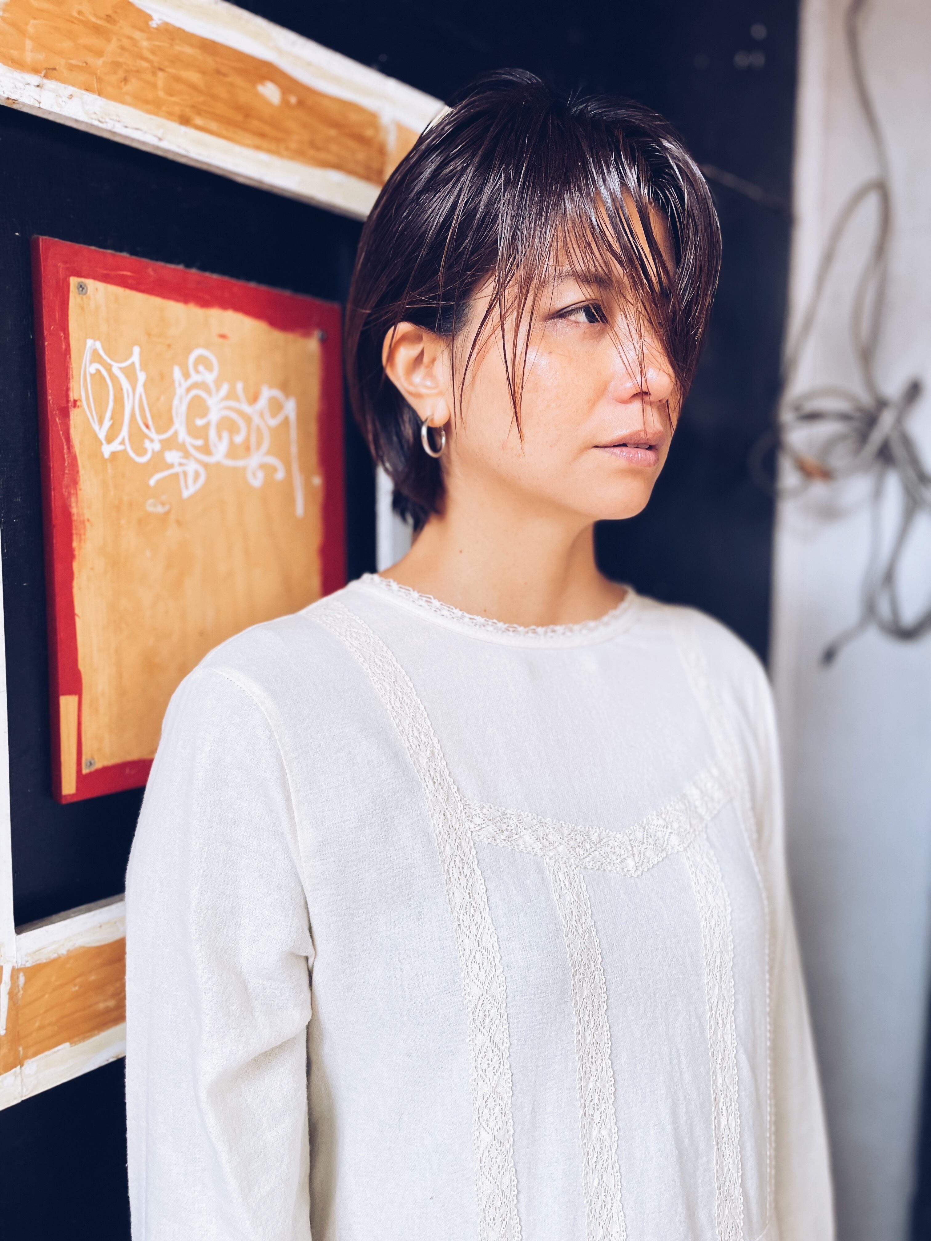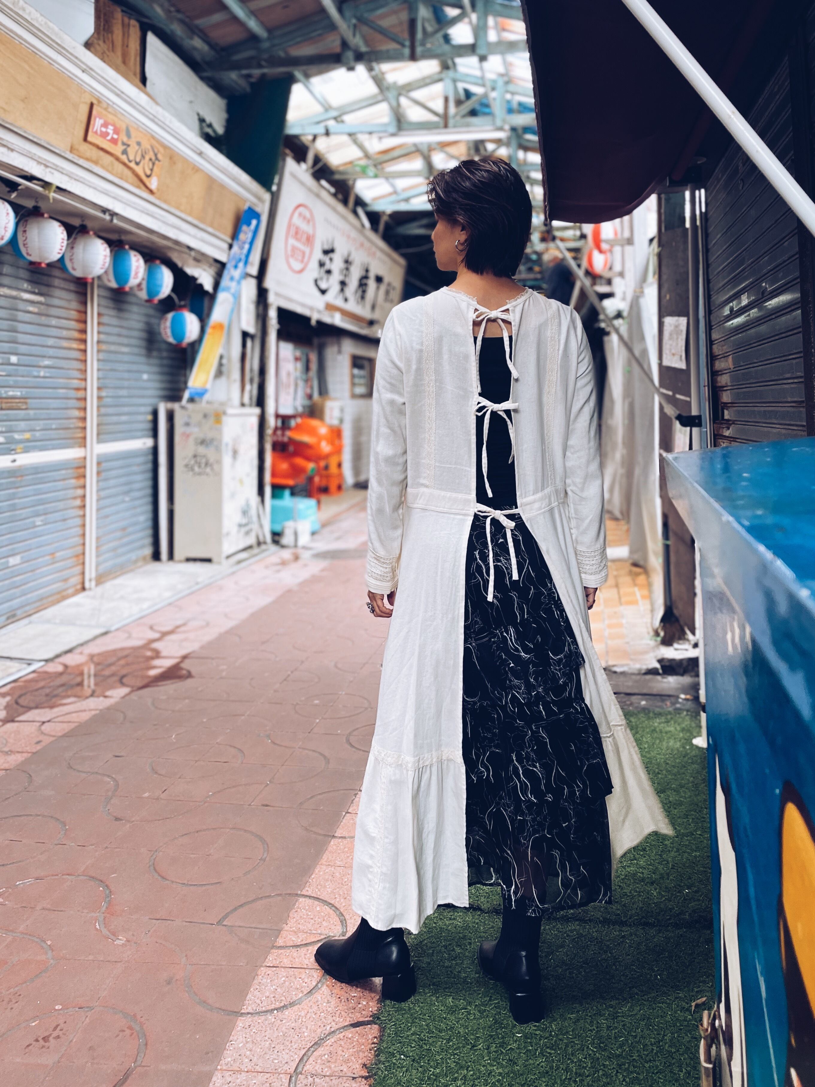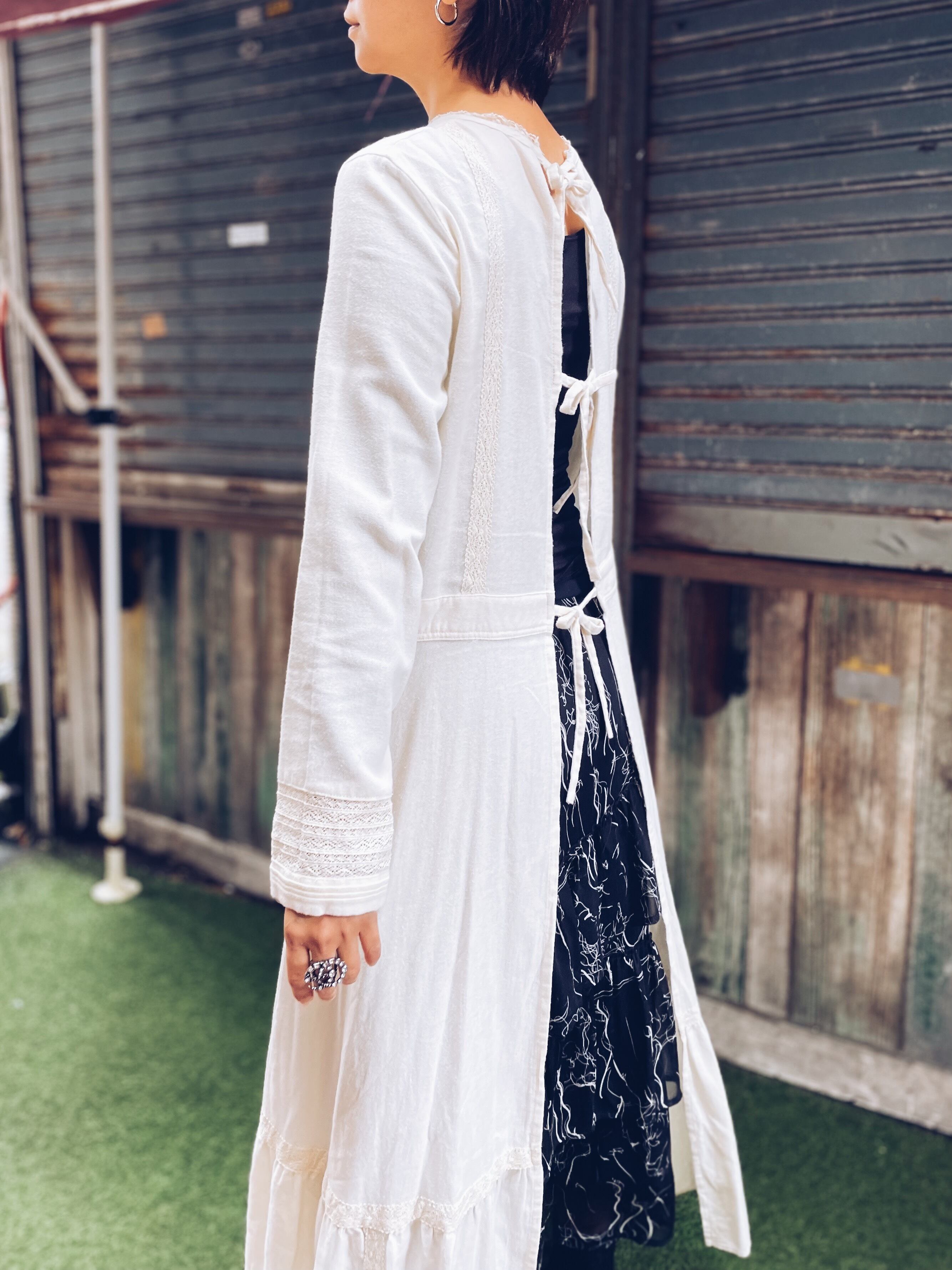 サージカルガウンの結んで着用できるデザインをそのままに、レース使いでナチュラルフェミニンなワンピにアレンジ。