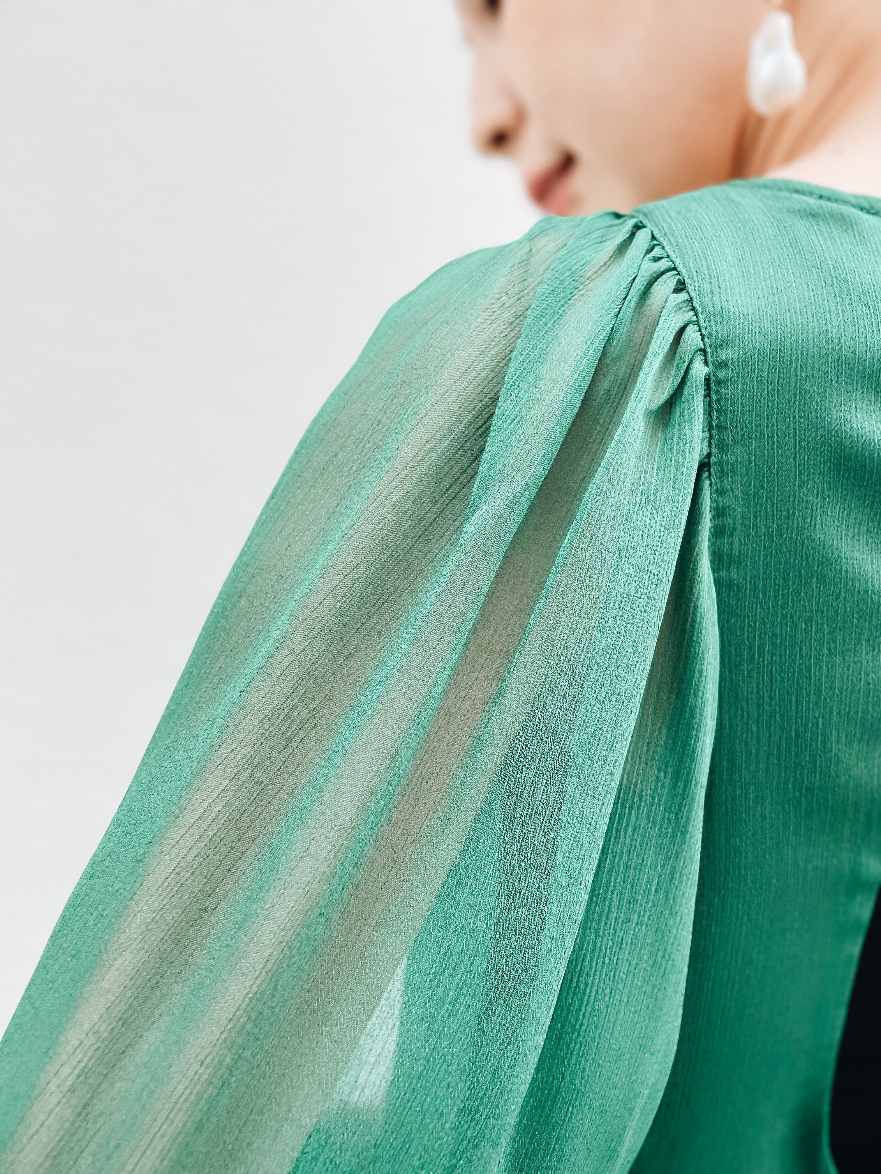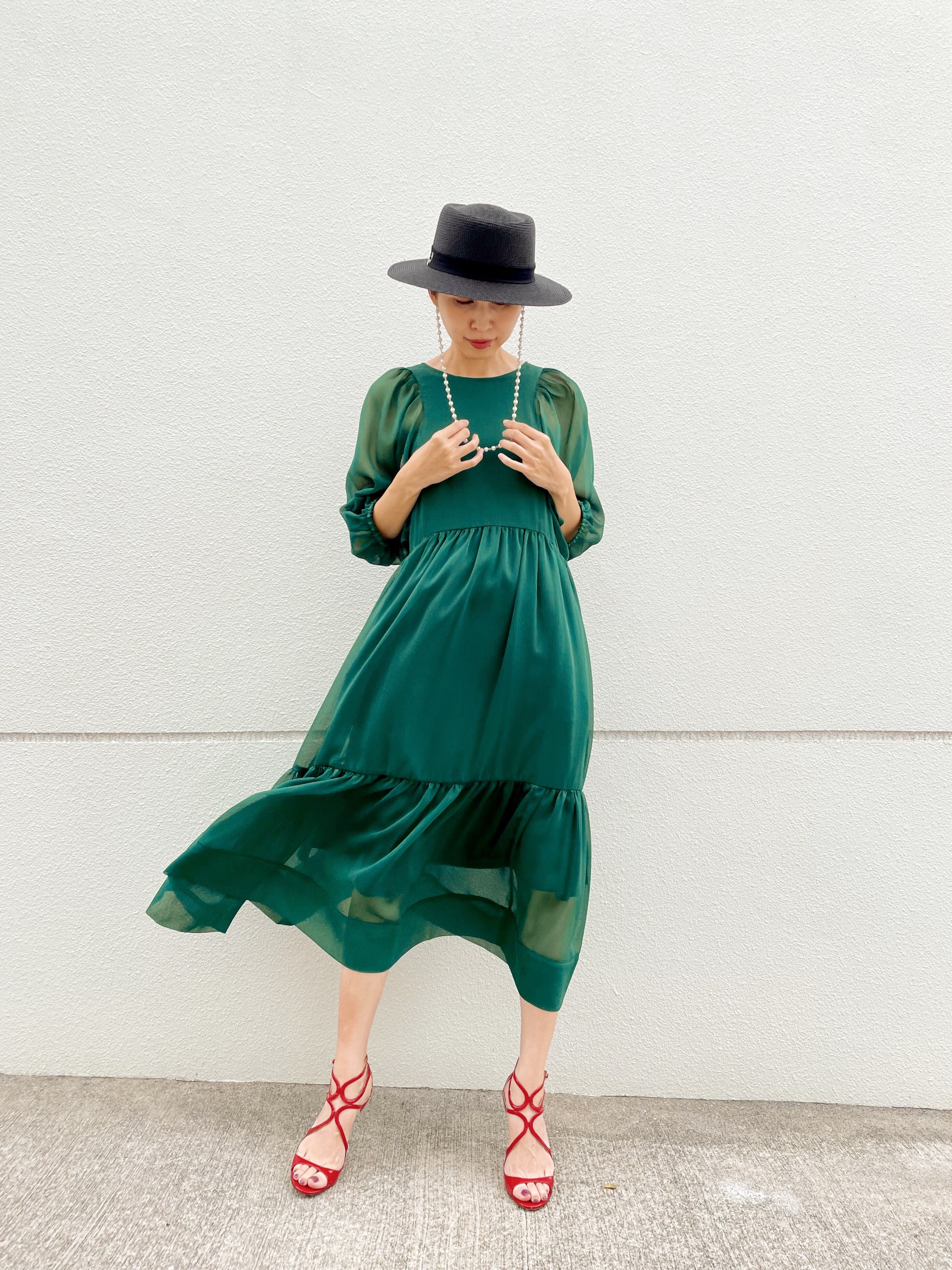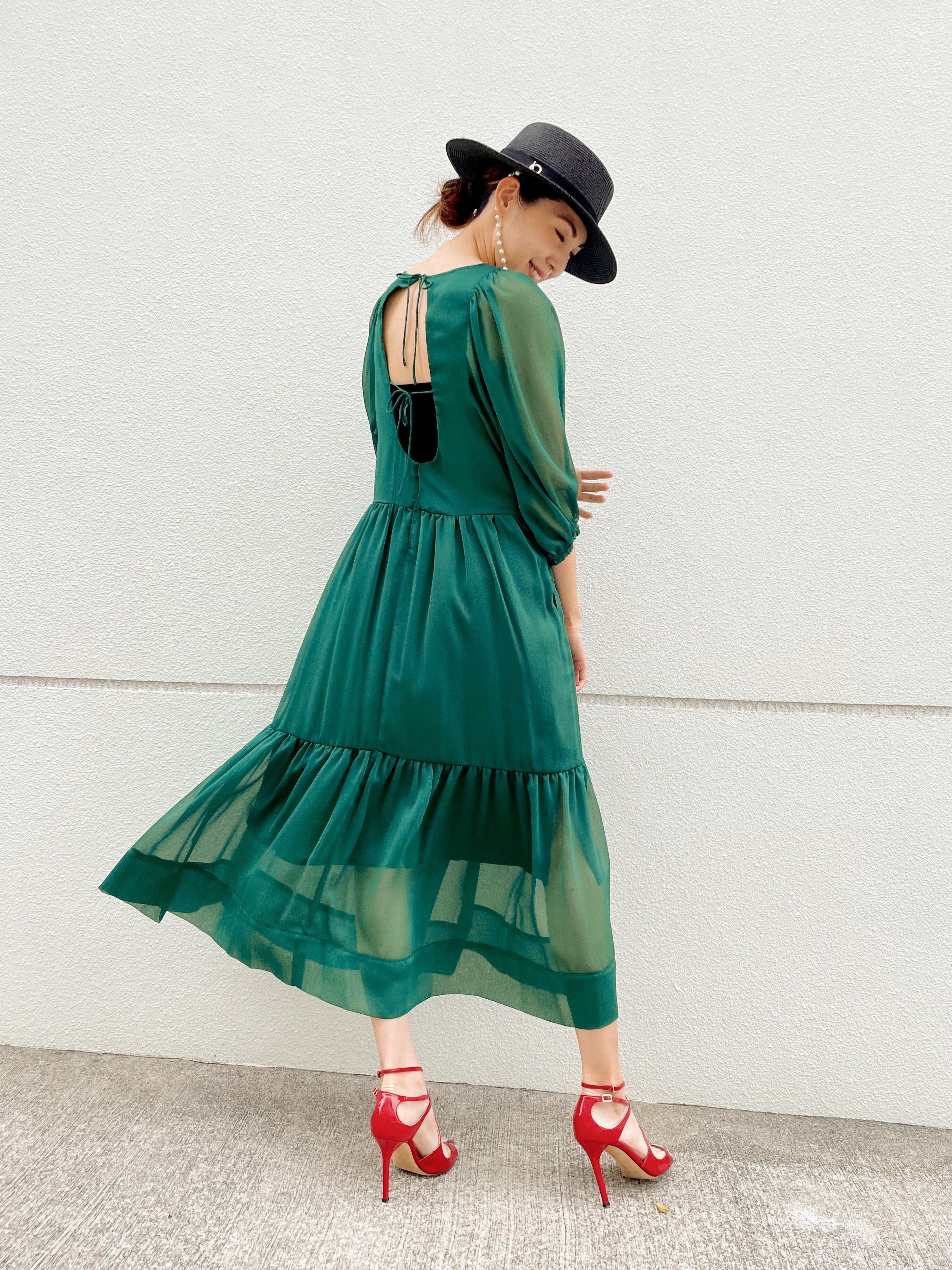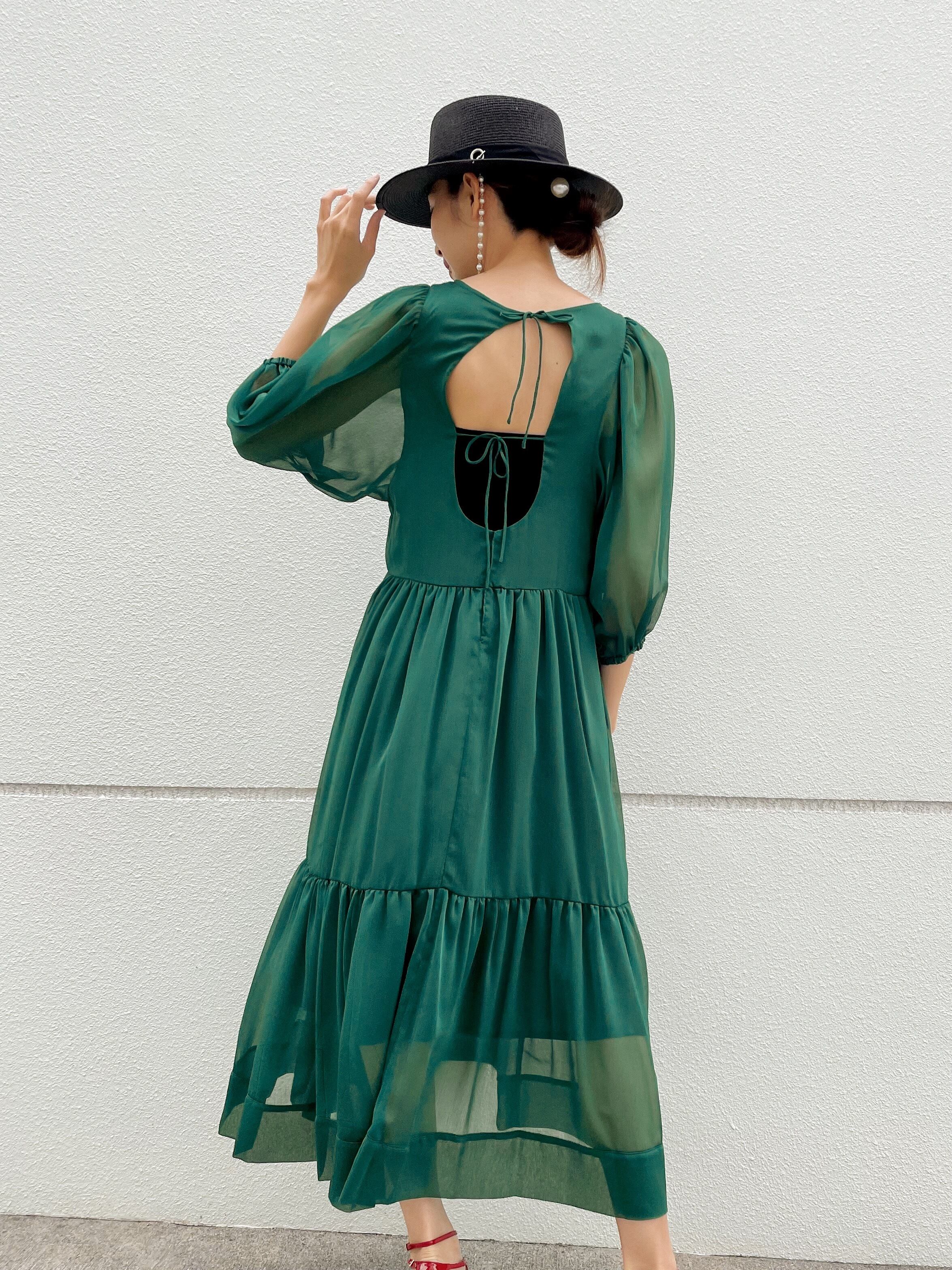 ロマンティックな雰囲気とバックスタイルのカットアウトがトレンド感のある、ボリュームスリーブワンピースです。