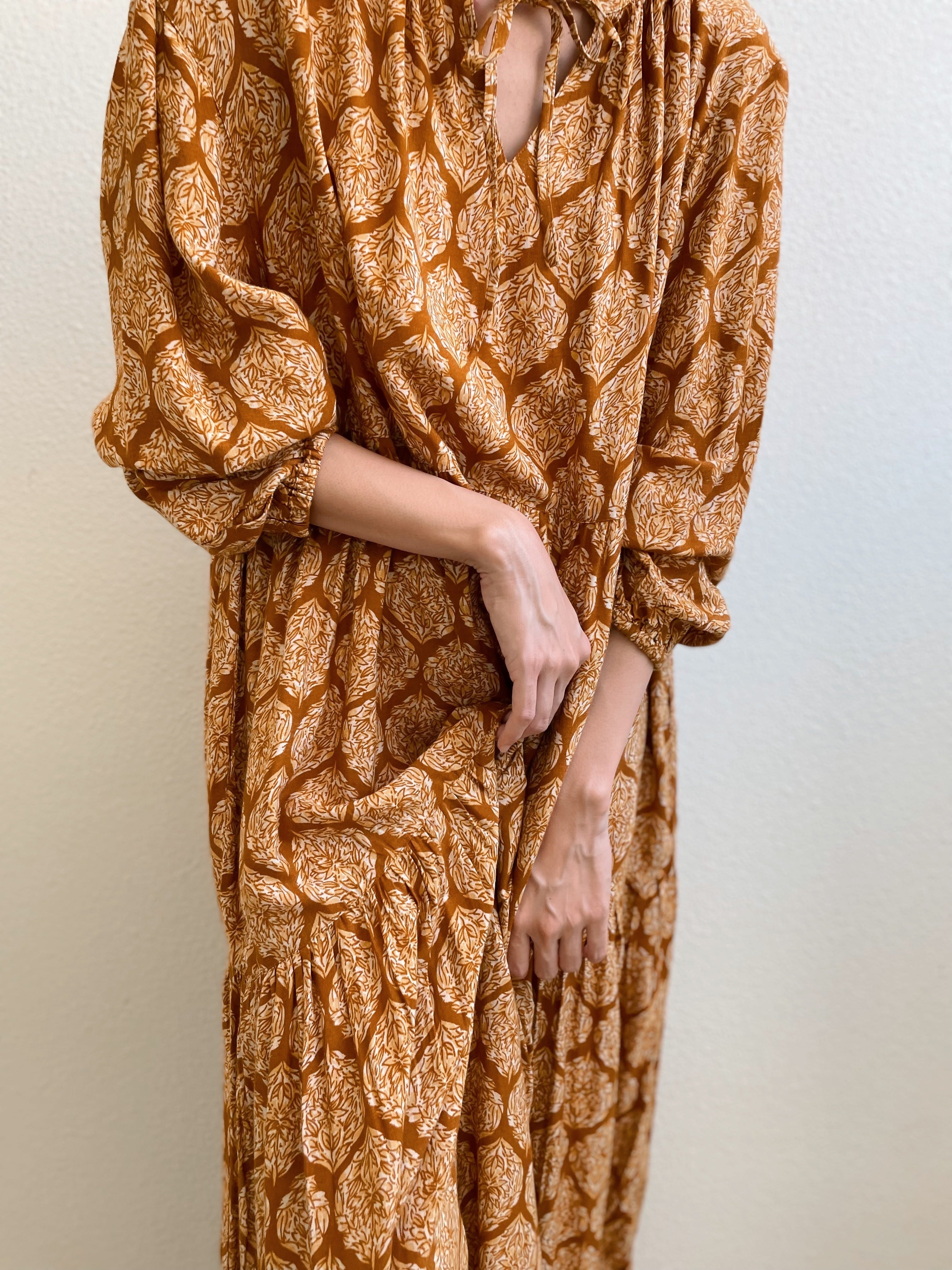 大人可愛いプリント柄が目を引く、1枚で仕上がるティアードワンピースです。