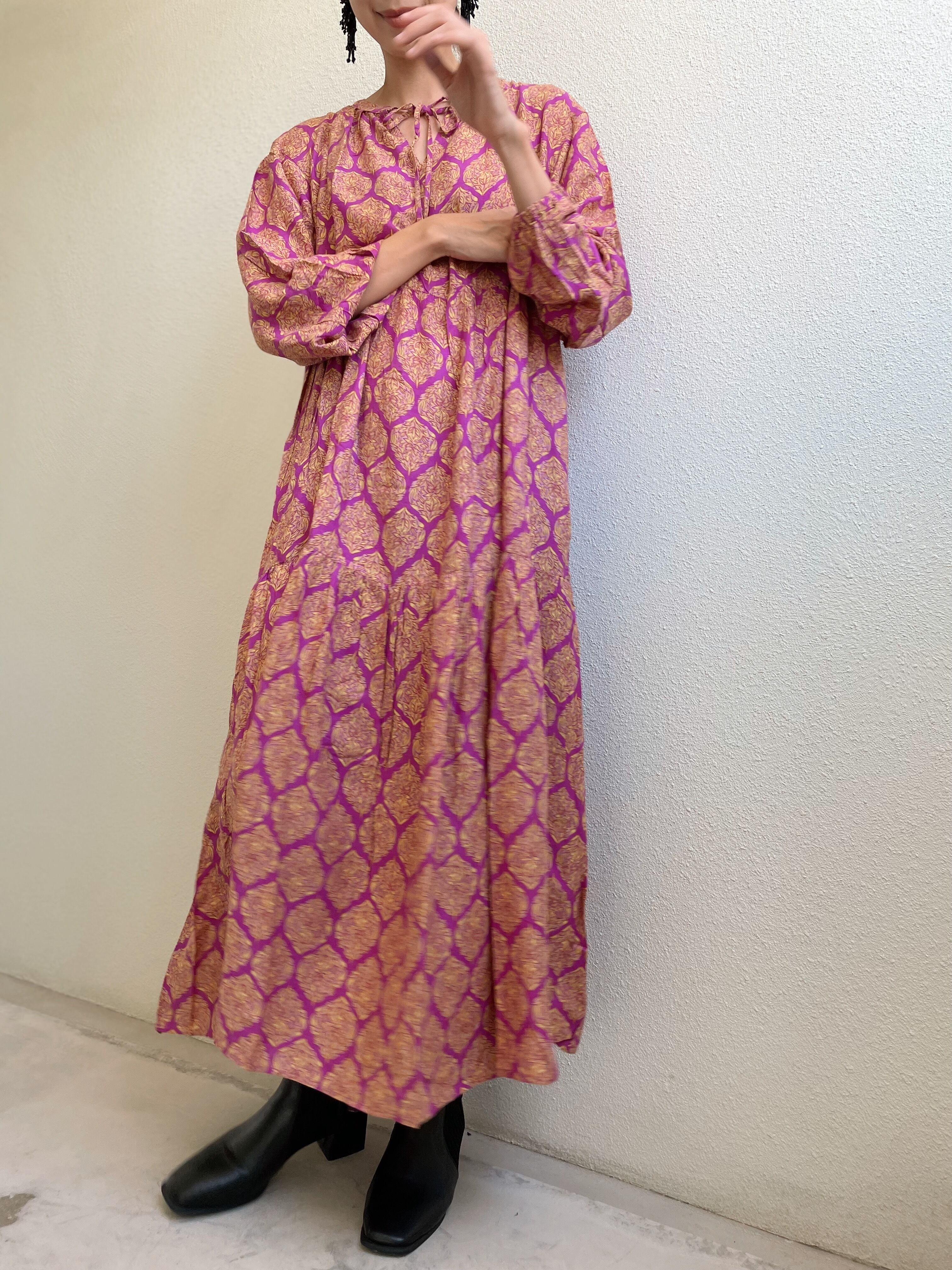 大人可愛いプリント柄が目を引く、1枚で仕上がるティアードワンピースです。