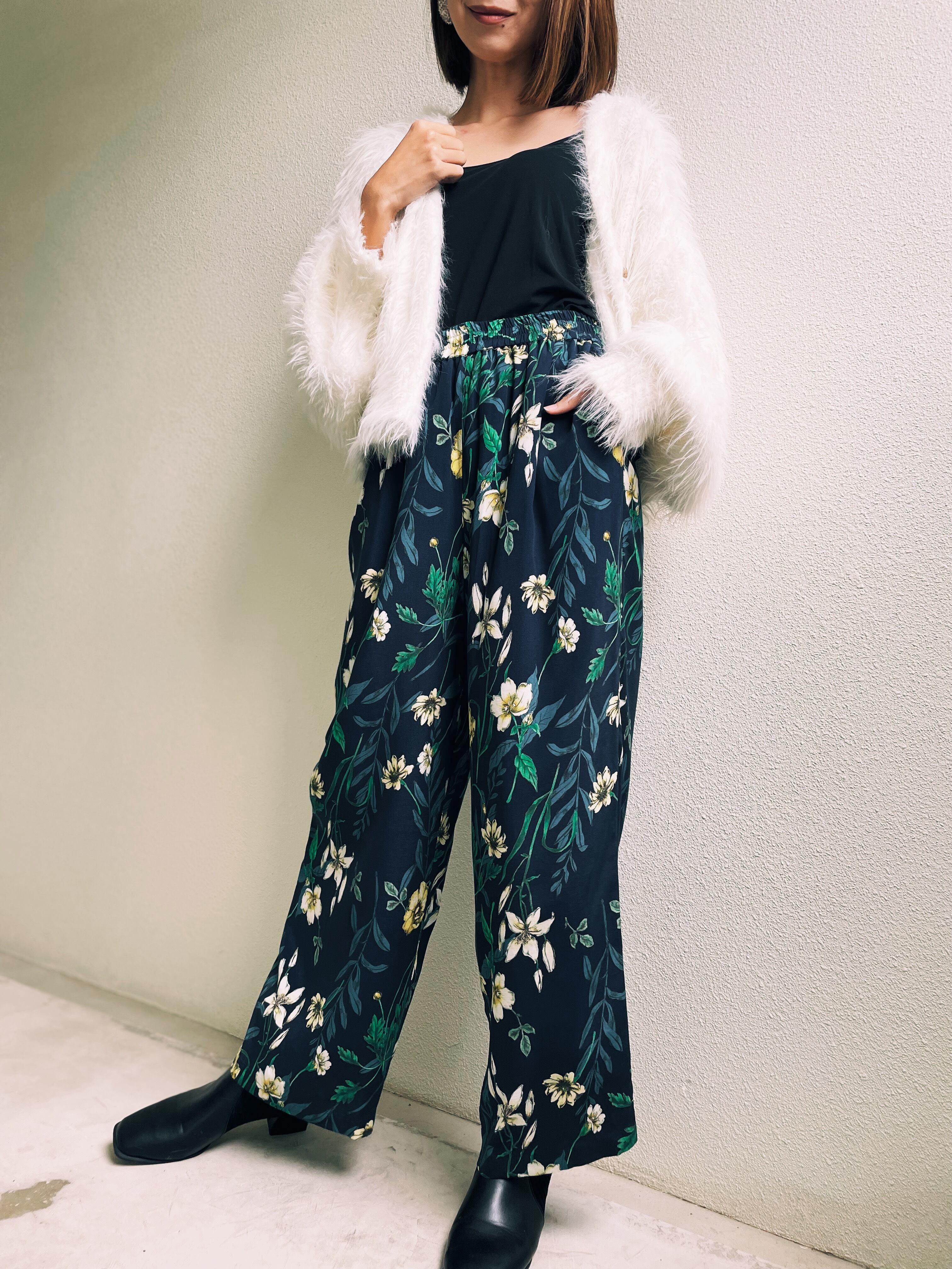 すとんとした落ち感と華やかなフラワープリントが目を引くワイドパンツ。