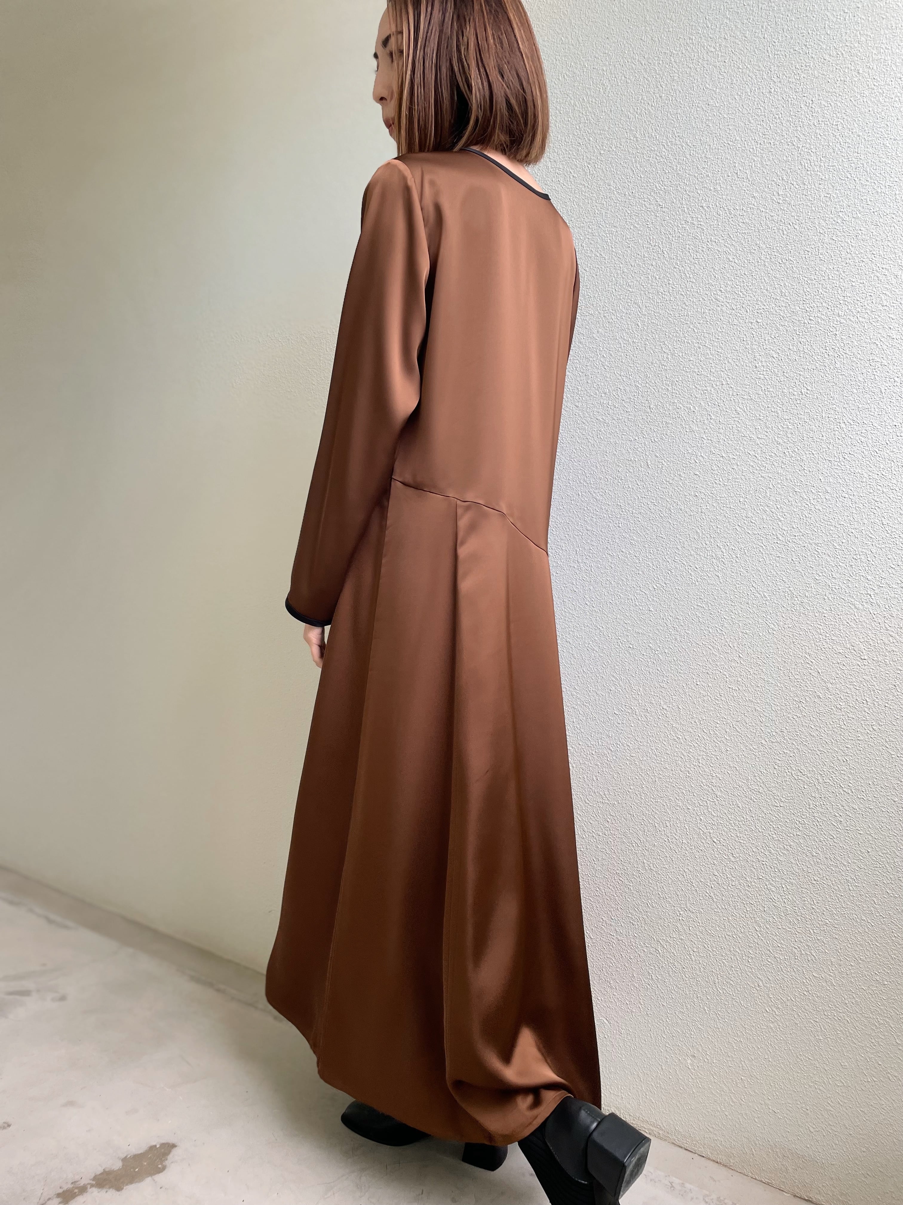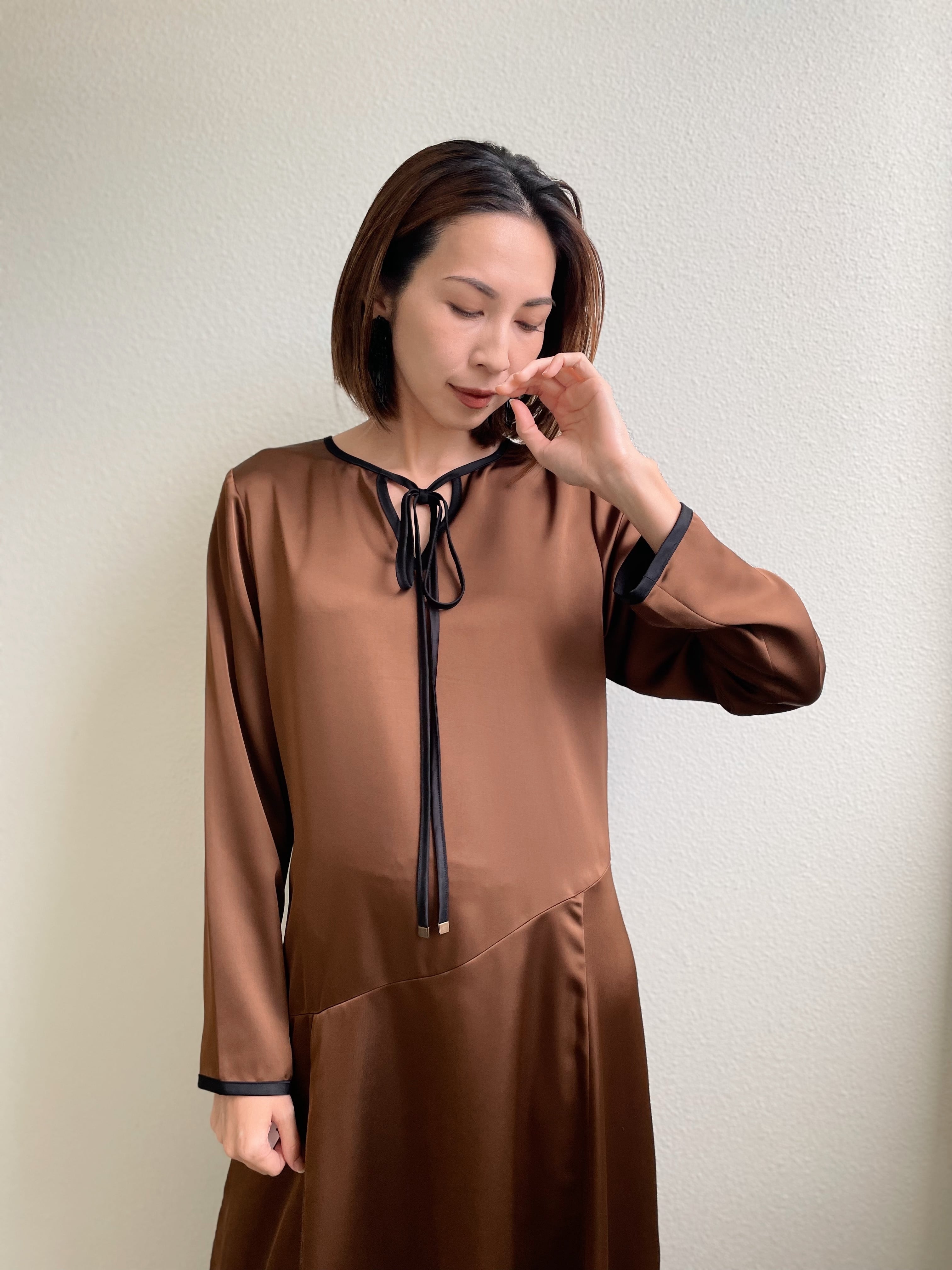 長めの丈と、落ち感のあるサテン生地はエレガントな雰囲気を醸し出し、ウエスト位置に入れた斜めの切り替えによって美しく広がる裾のフレアが上品さをプラスしてくれます。