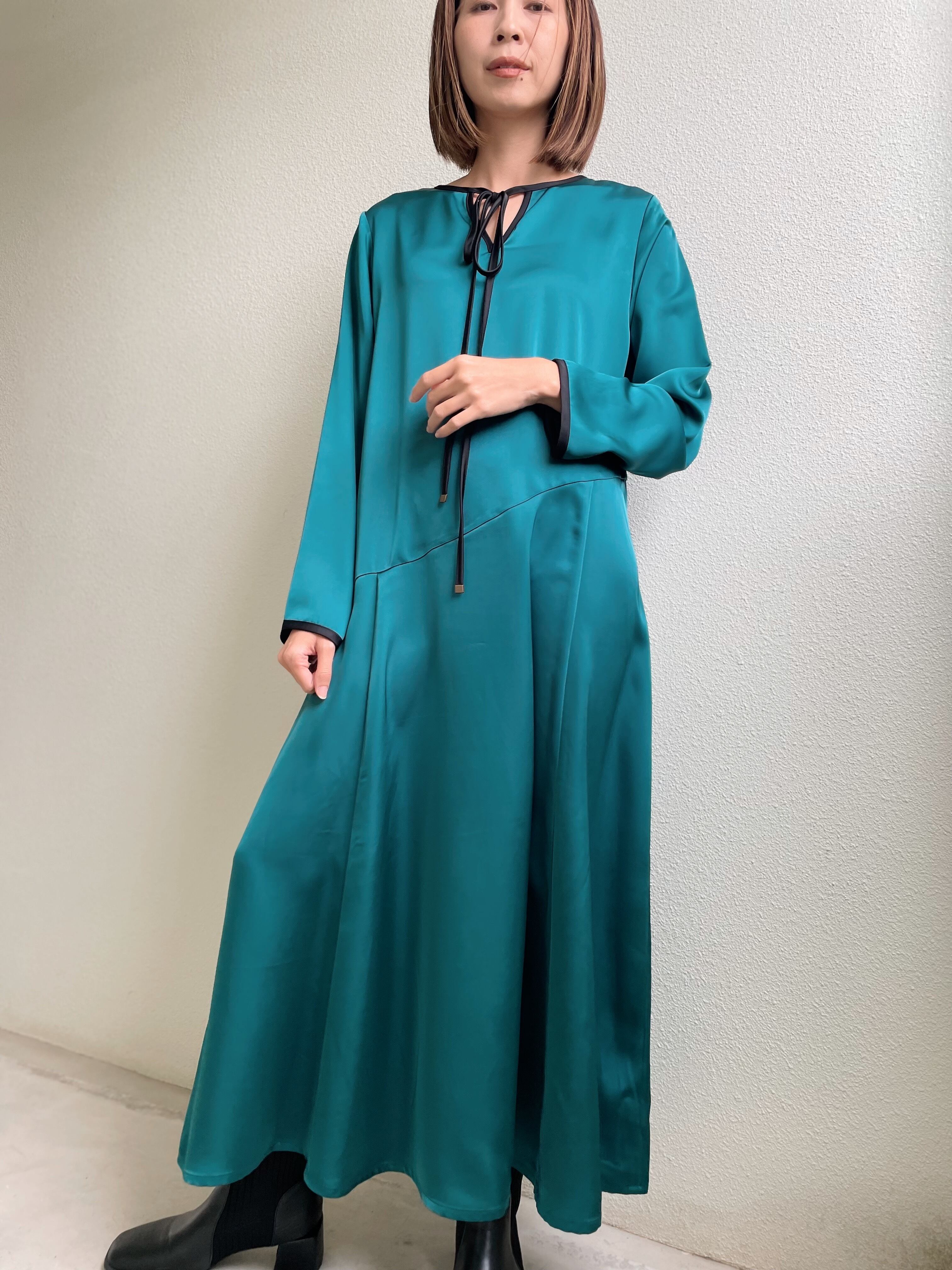 配色のパイピングがアクセントになったサテンワンピース。