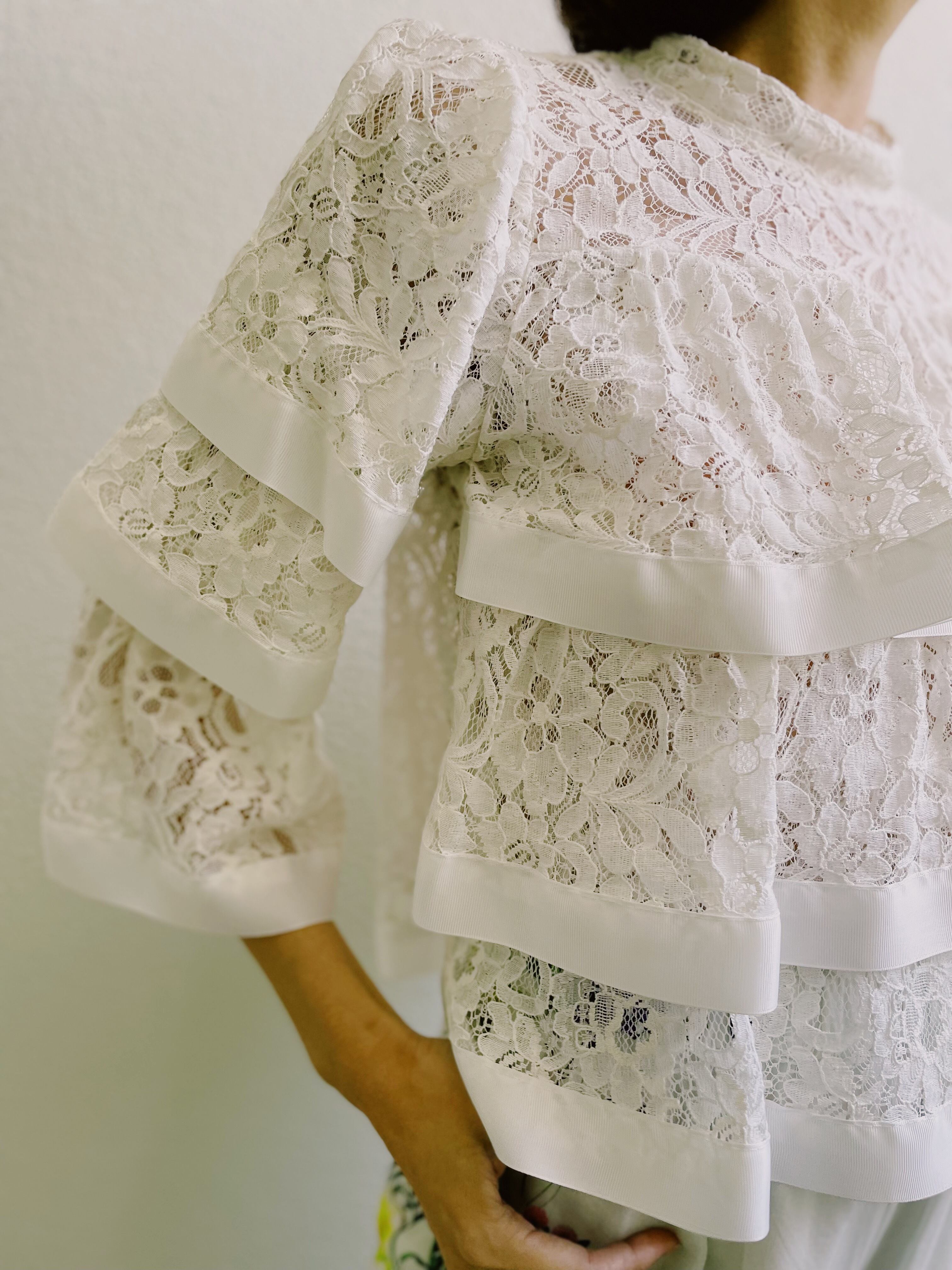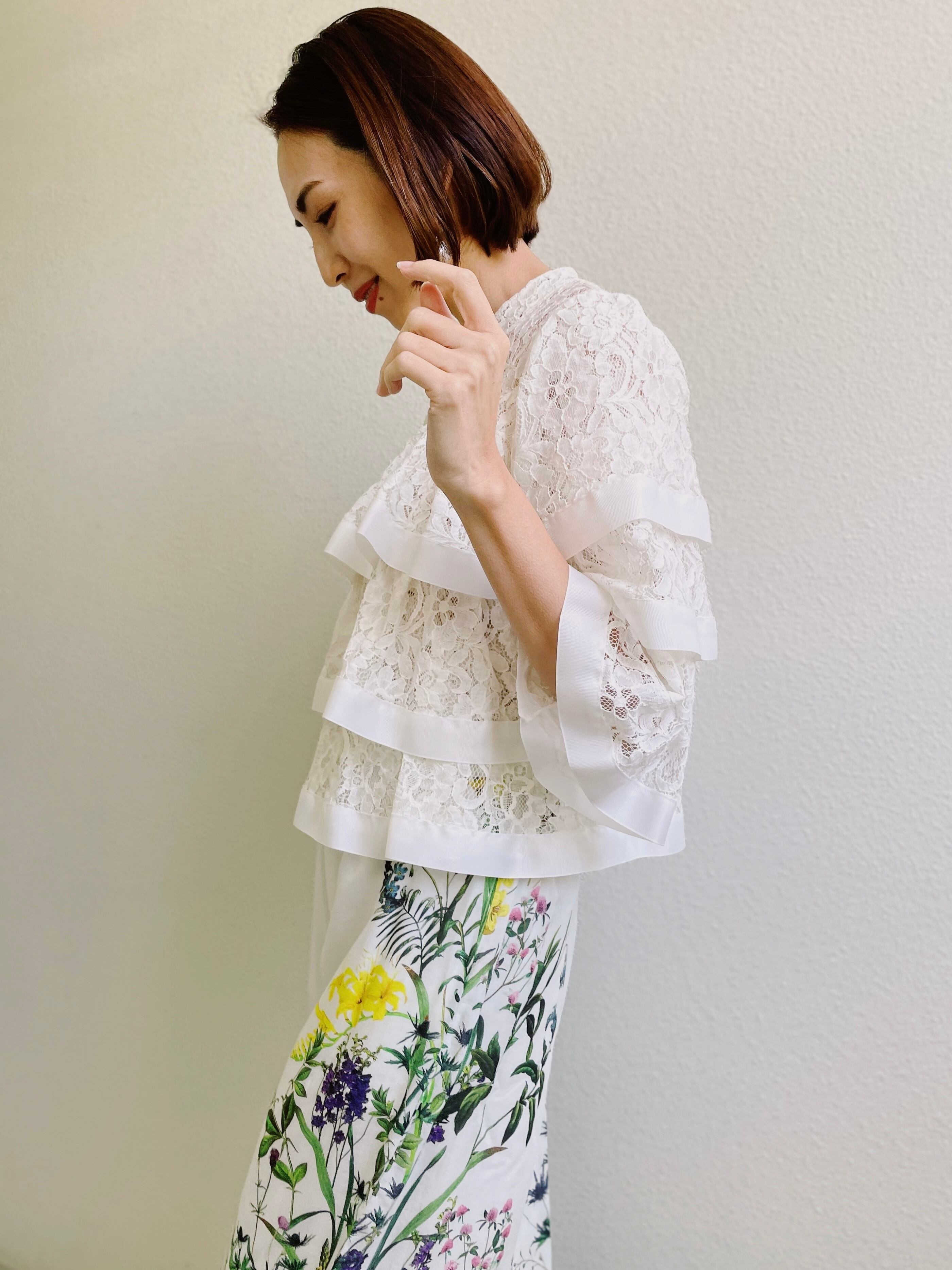 レース地をティアードタイプにしたブラウス。