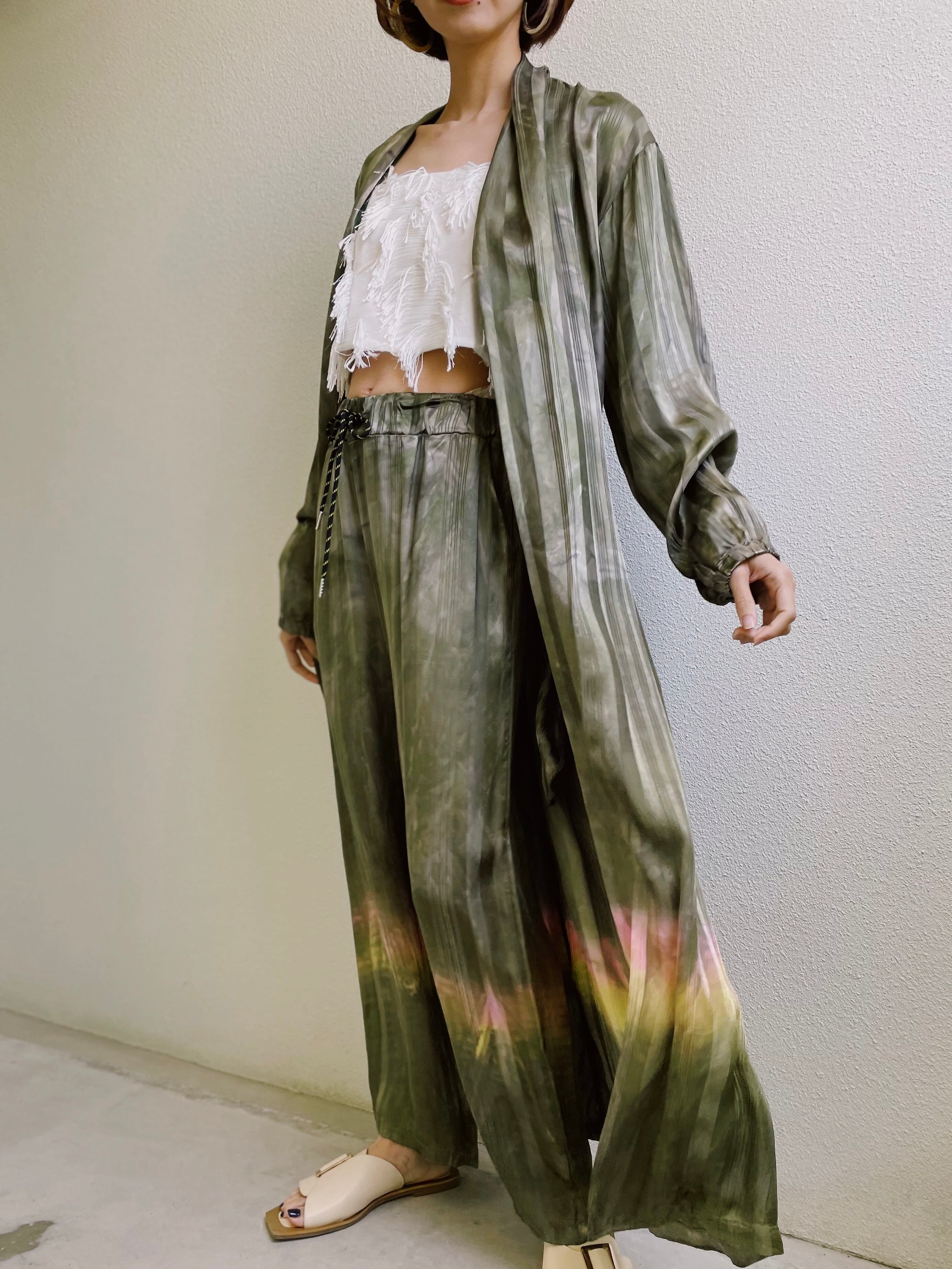 全体はニュアンスのあるストライプ柄で、縦のラインを強調しスタイルアップ効果も。 裾はグラデーションをボーダーのように仕上げ、手作り感のある染めが際立ち、お洒落度をグッと引き上げてくれます。