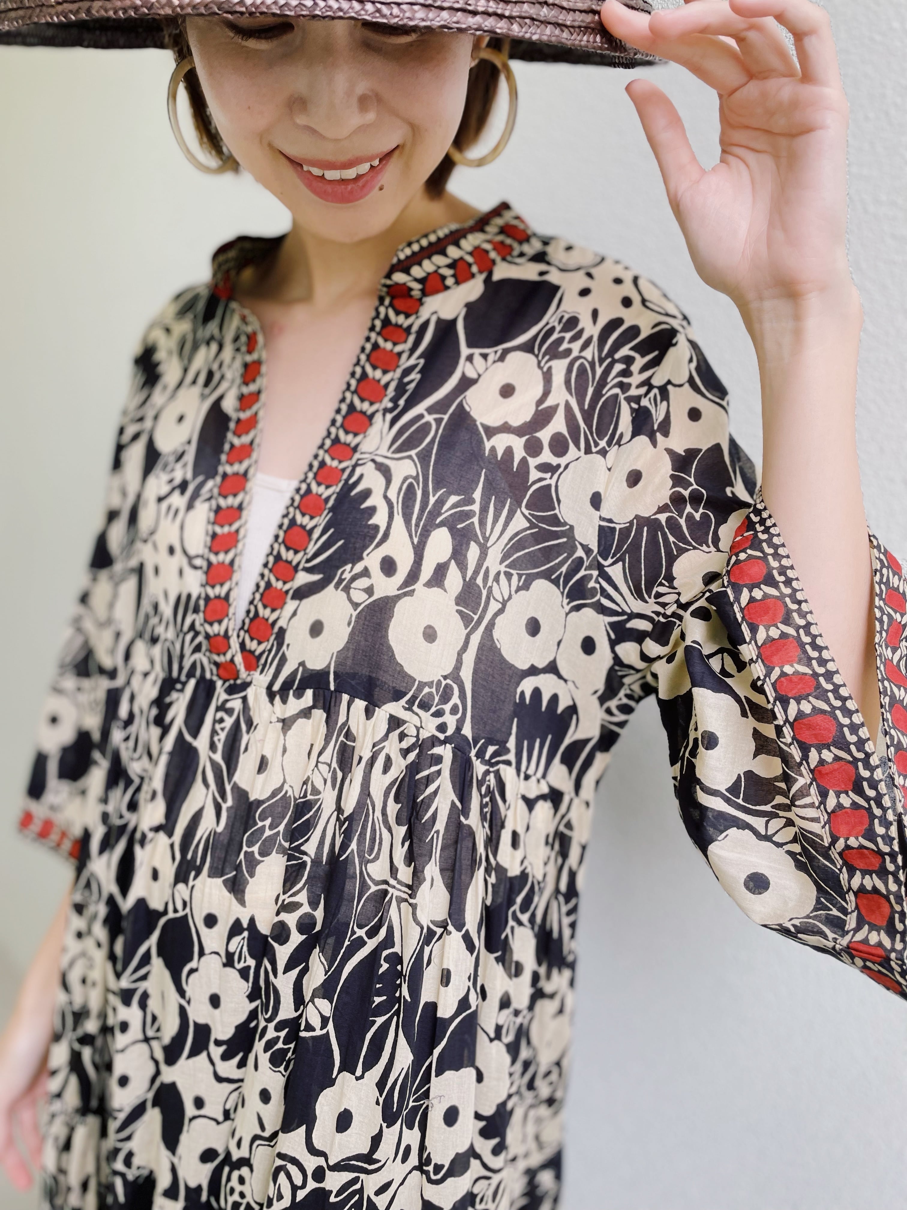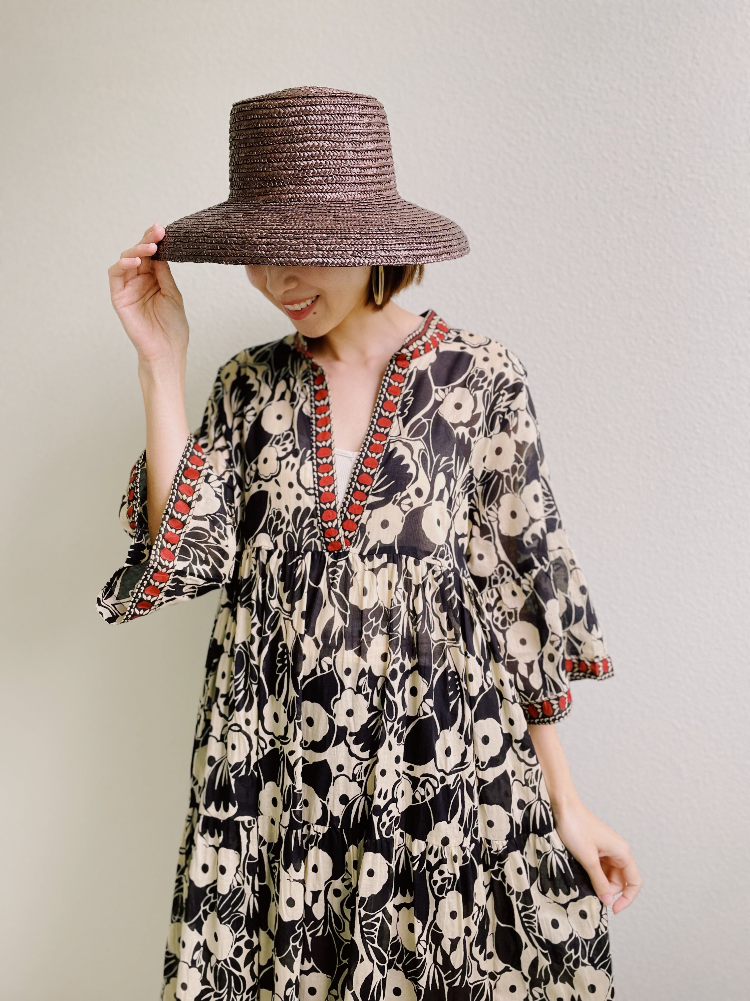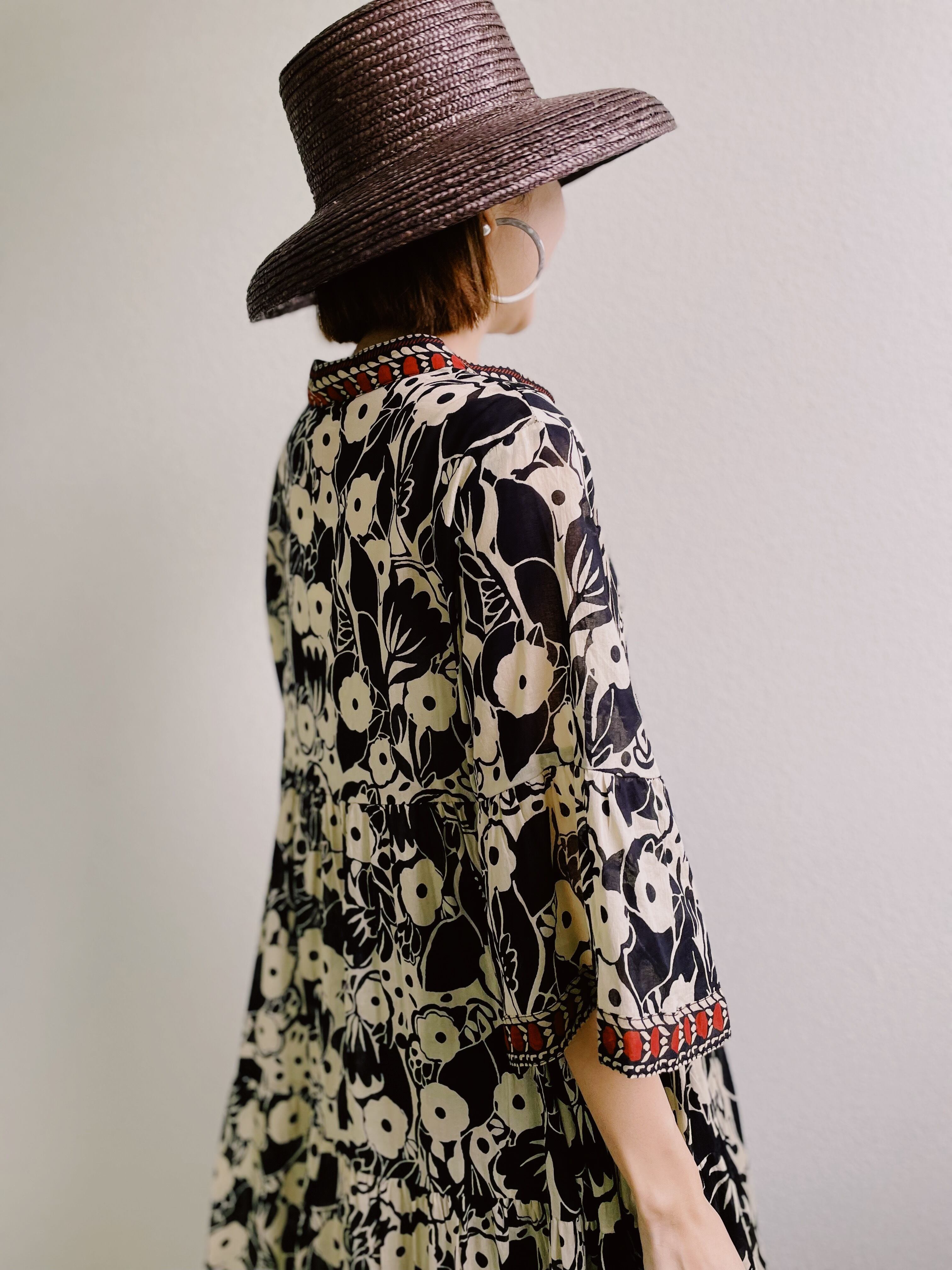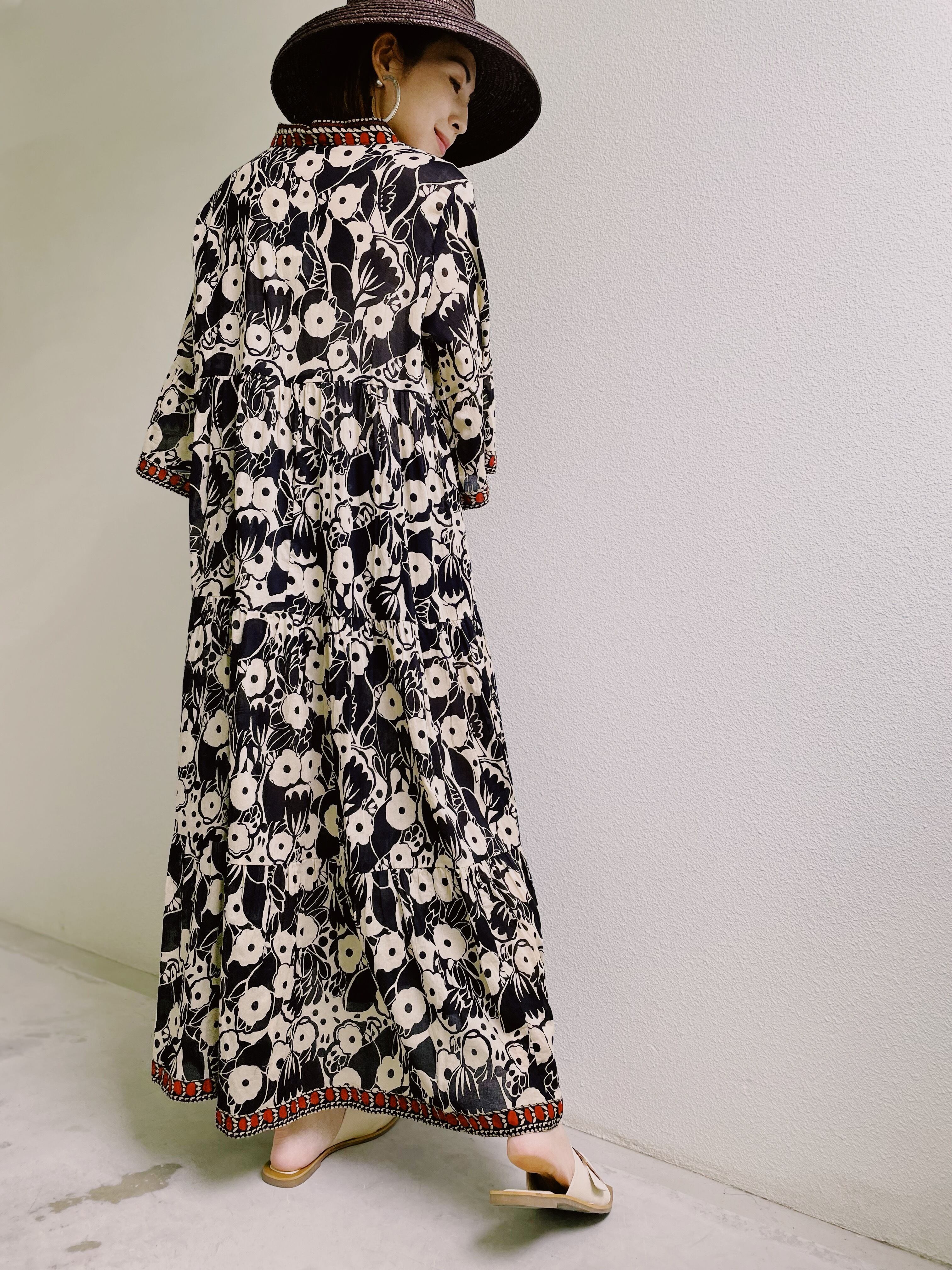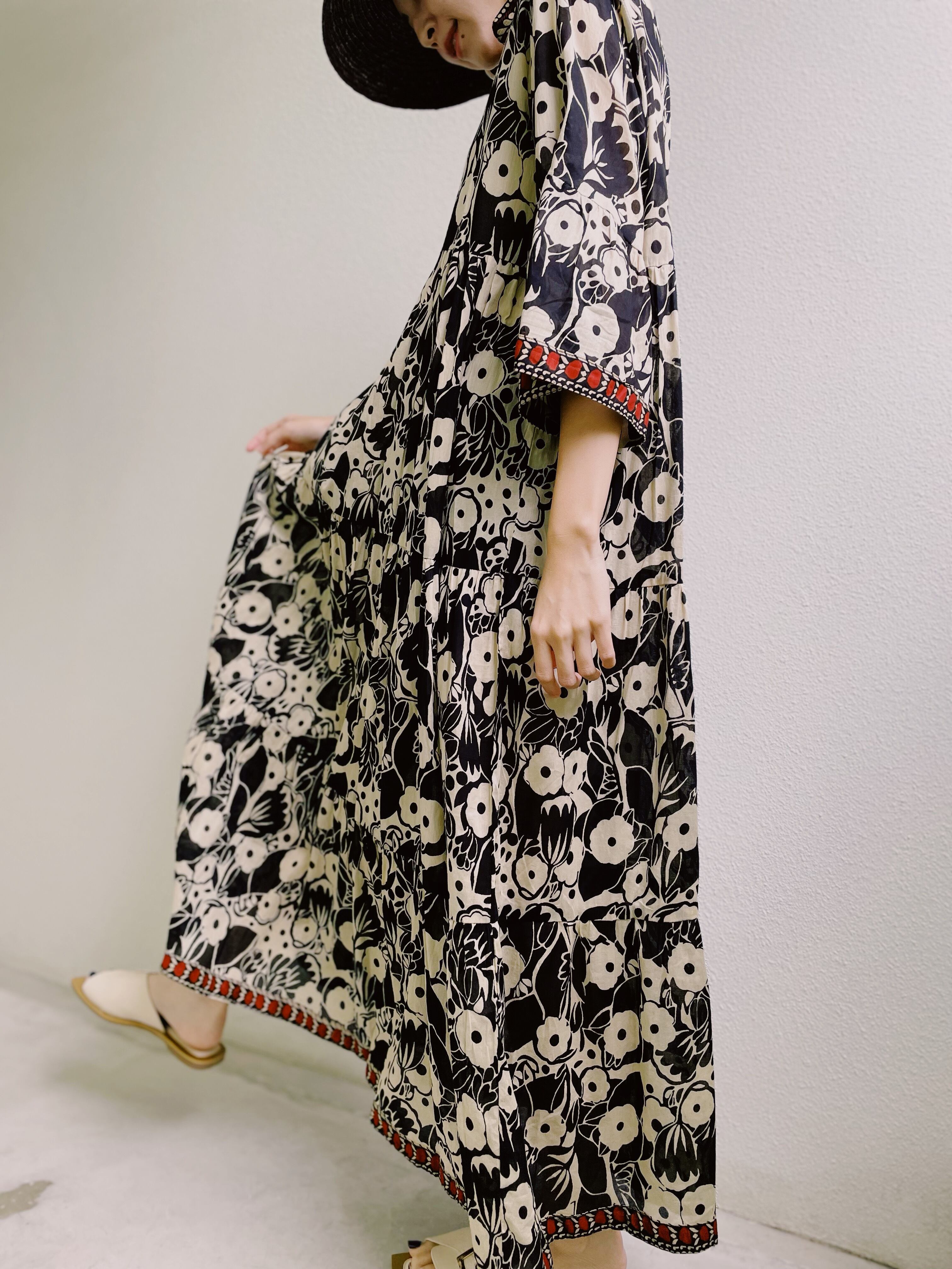 ワイドスリーブ スキッパーネック フラワーティアードワンピース / ブラック
