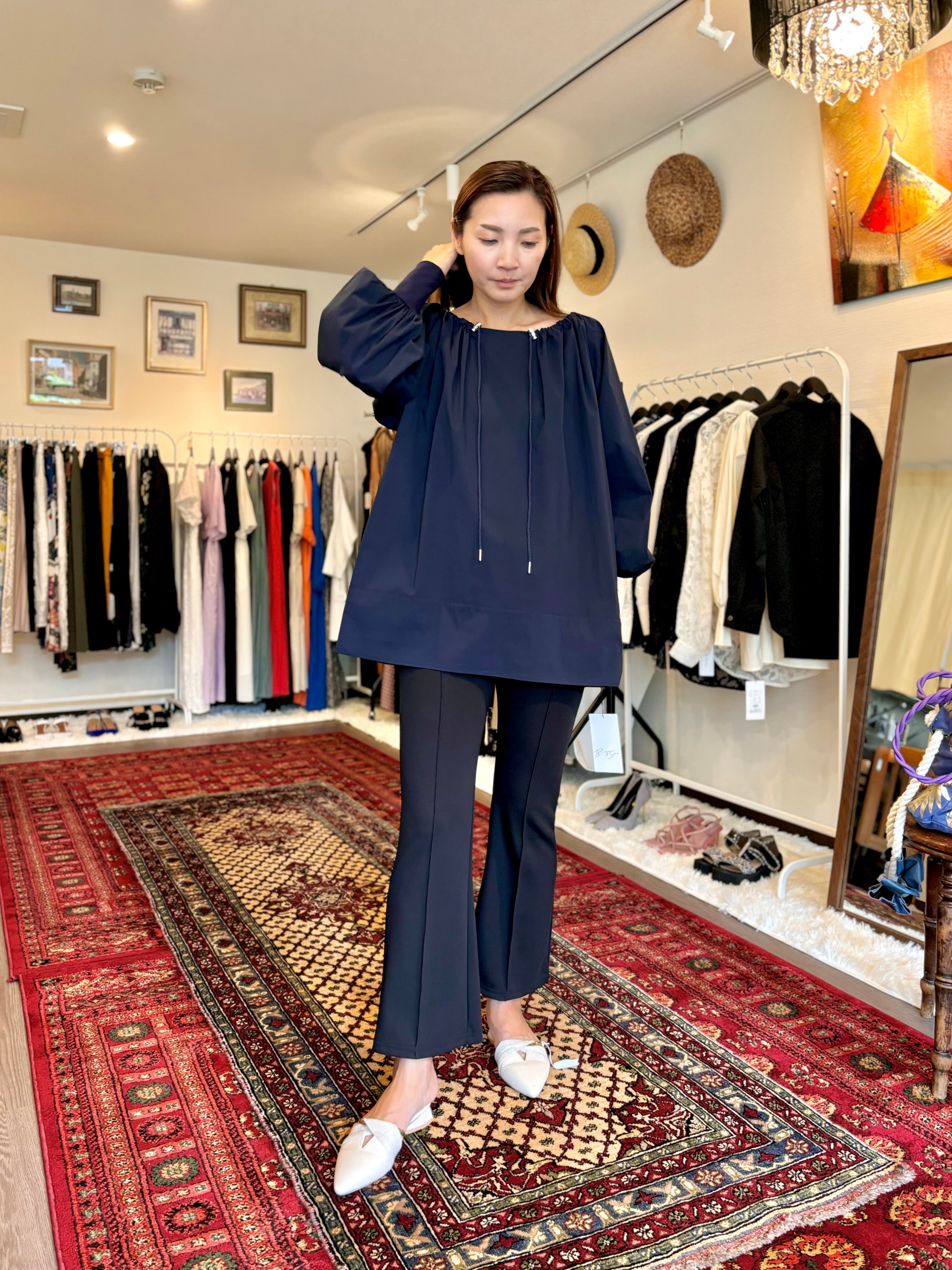 衿ぐりのドロスト仕様で、デコルテ周りの開き具合を調節して頂けます。