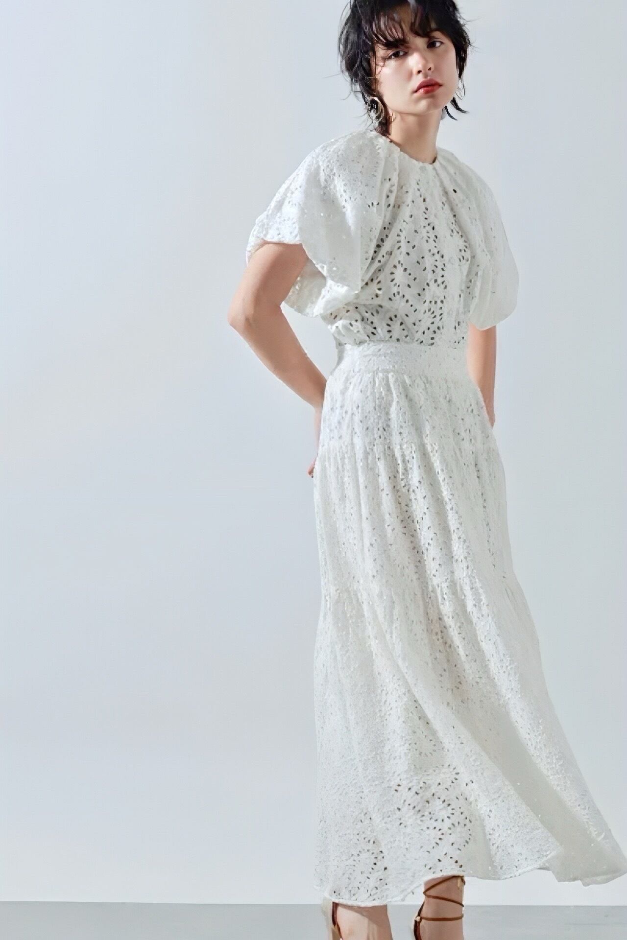 ボリュームスリーブがトレンドライクで1枚で着映えする旬なレースブラウス。