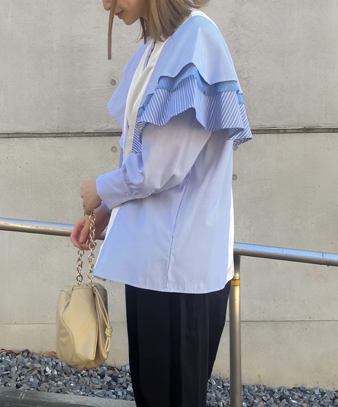 甘くなりがちなフリルも、カジュアル感のある袖デザインとマッチングさせることでモード感をプラスし、遊び心のある一枚に仕上がりました。