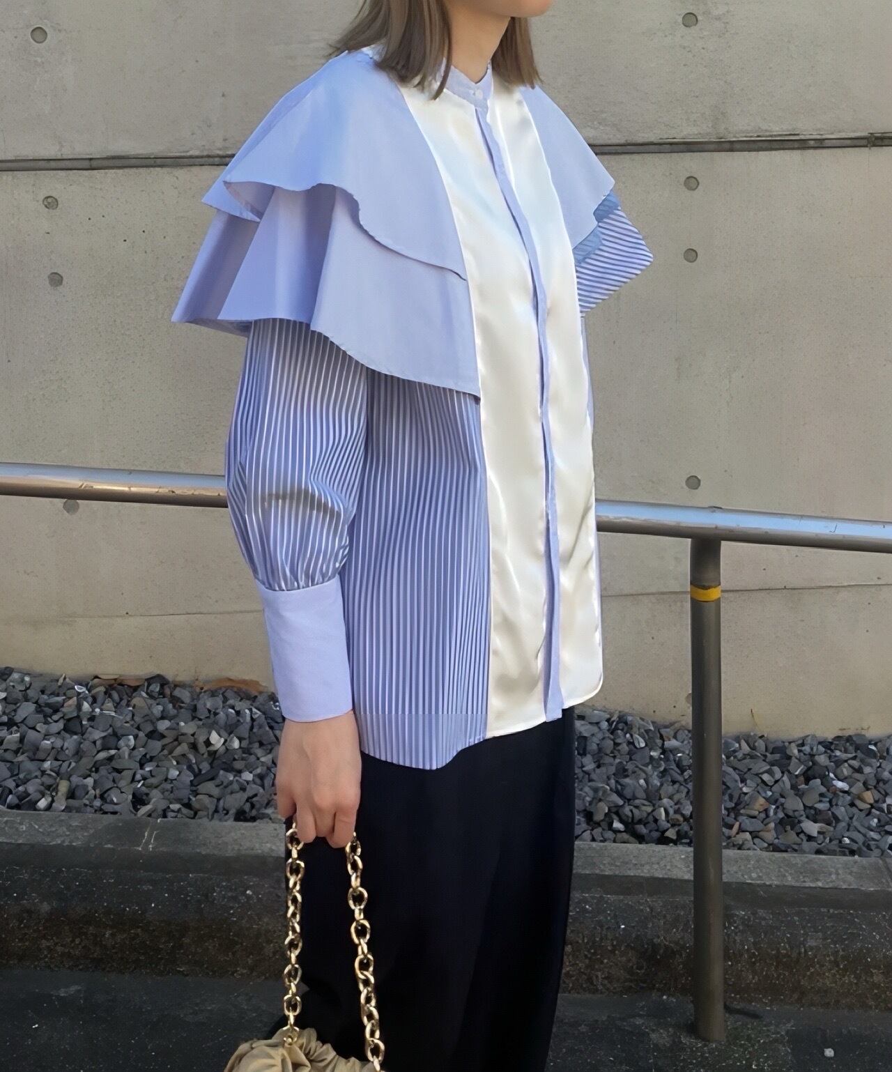 ボリュームのあるシルエットの中にもバンドカラーによって顔周りはすっきりとした印象に。