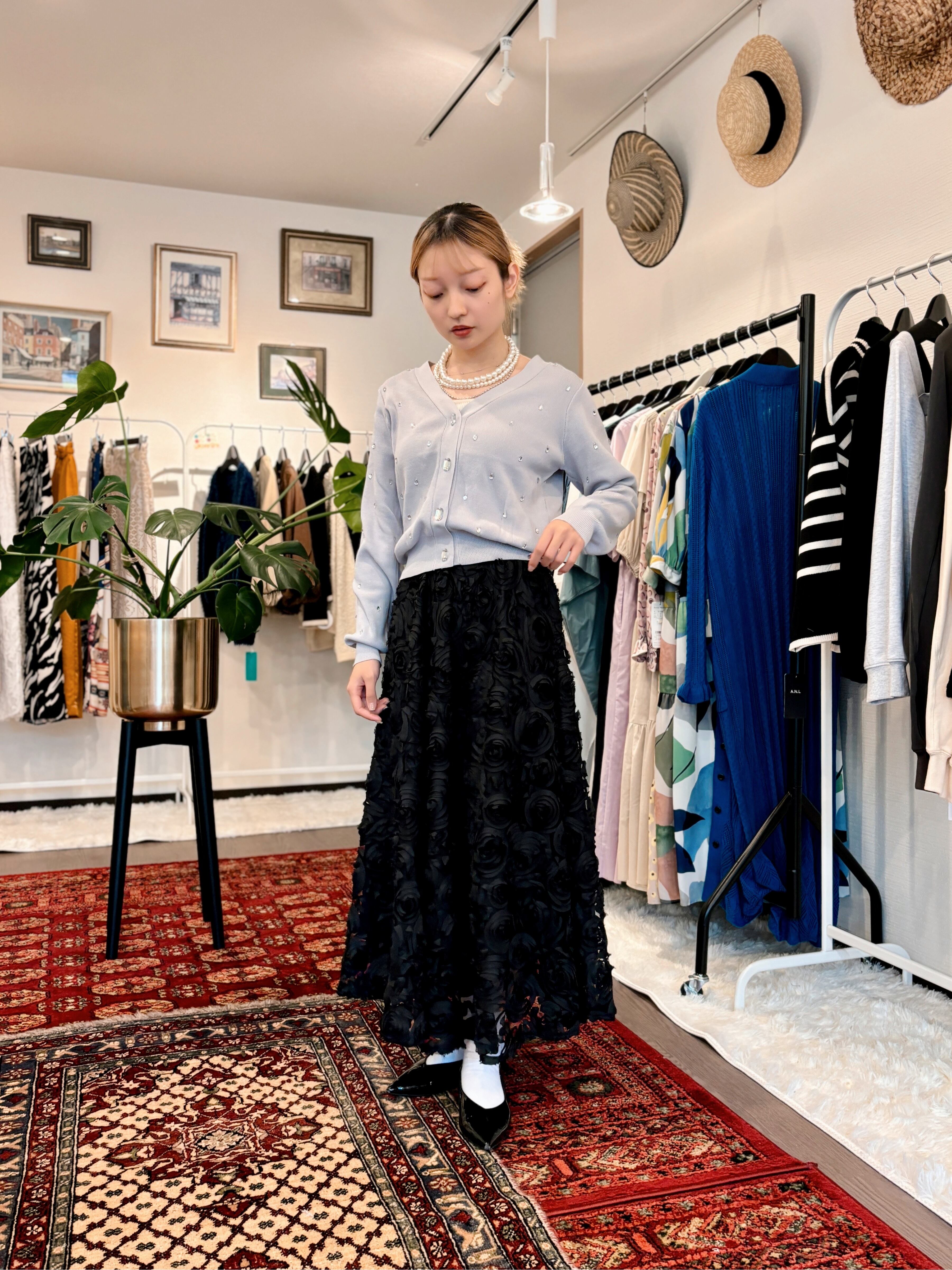 12ゲージの上品見えするニットに、フロントと袖にしずく型、前立てには大きめのスクエア型のラインストーンを配し、キラキラと輝き煌びやかで華やかな一枚に仕上げました。