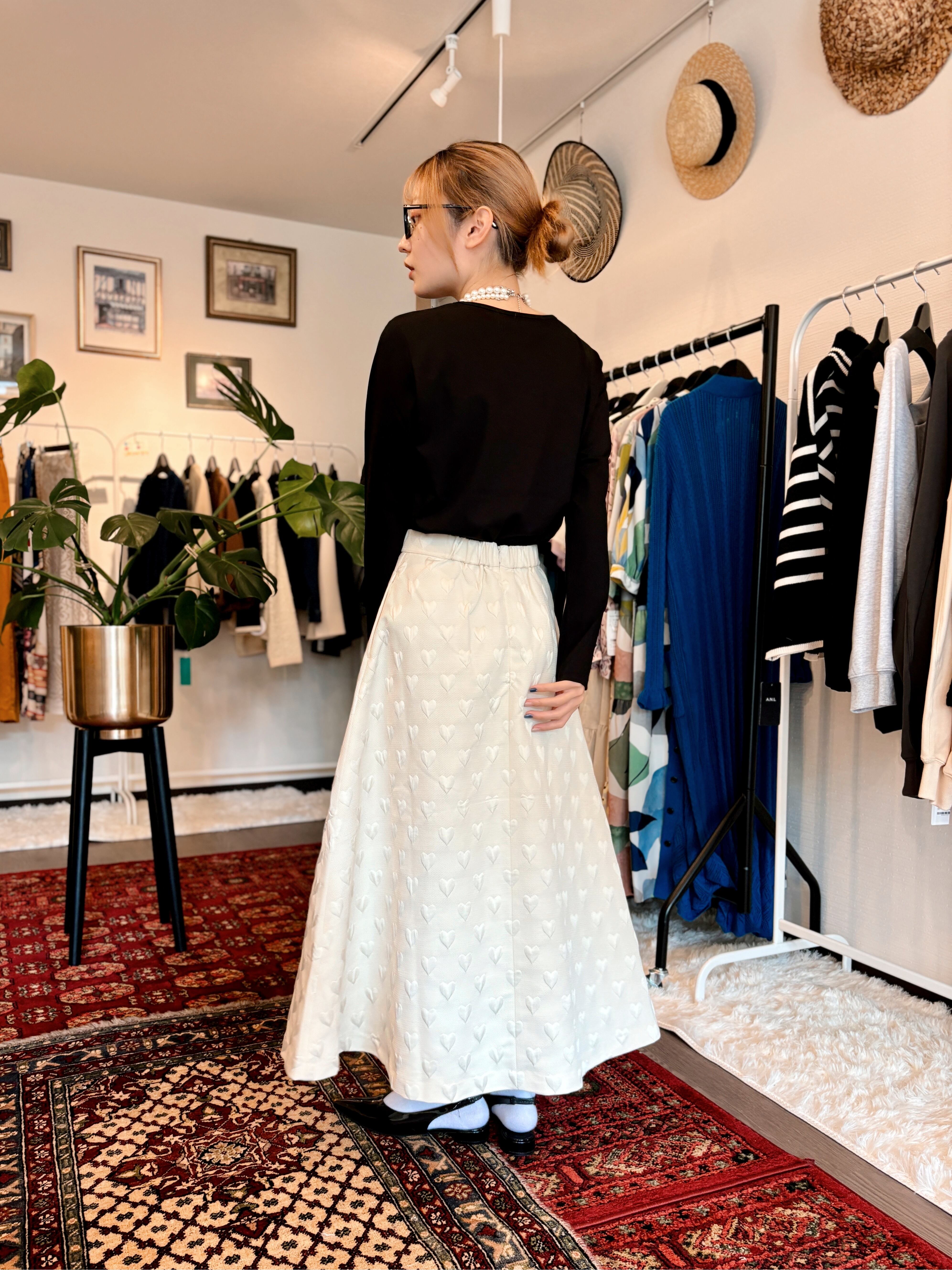 ベーシックなロングTシャツのフロントにたっぷりとチュールフリルを施し、立体感や存在感のある華やかな一枚に仕上げました。